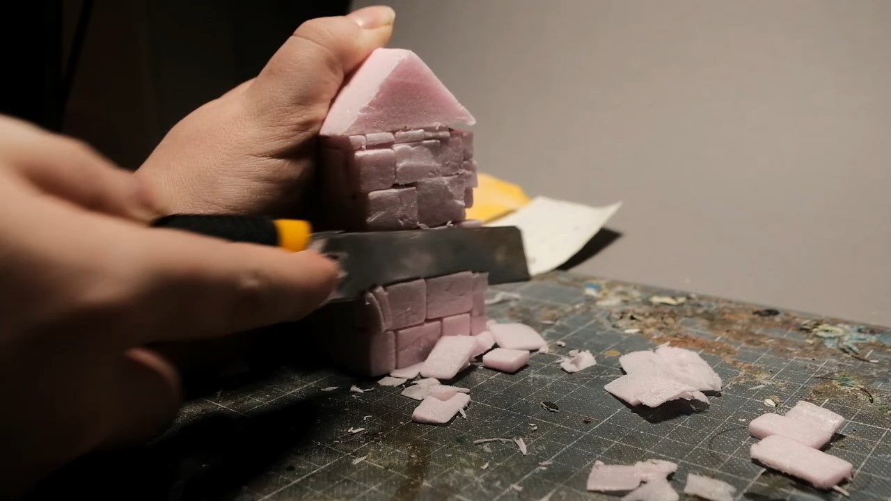 At around this time I decided that a simple square building would not be enough, I needed something more special, I needed.. corner pillars? To that end, I got my knife and once again behaved somewhat irresponsibly with it, slicing a 45 degree bevel into each corner of the structure.