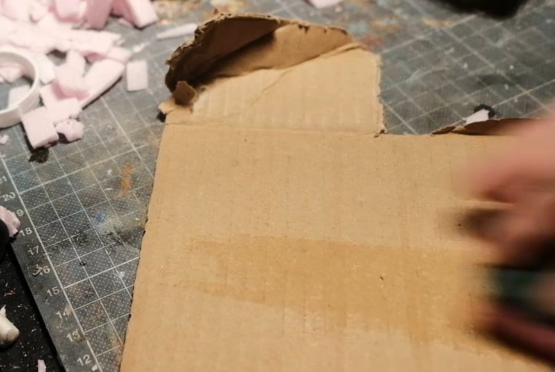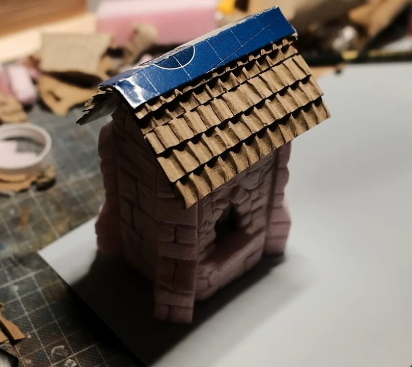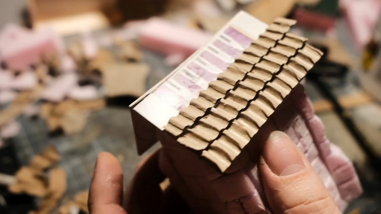 Damn, remind me to trim my fingernailsThe layers of corrugated cardboard strips build up into a nice looking roof. It's important to use the strip layering method for this though, otherwise your roof will look like a piece of corrugated metal, not exactly the style we're looking for with this one!