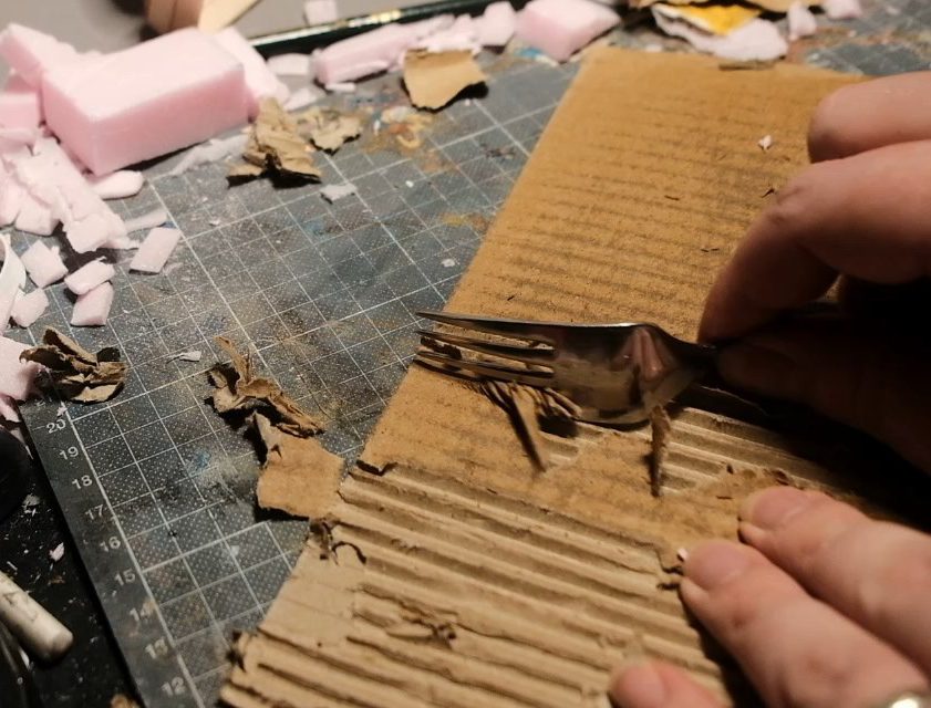Not looking too bad eh? Up next is the roof. I decided to break with the shingles I'd used previously and try something different, namely a terracotta pantile pattern roof. In order to do this, I grabbed a bit of corrugated cardboard with a good bit of heft to it, it needs to be reasonably big so the wave of the tiles is pronounced and legible. I slightly dampened the top layer of the cardboard and then used a fork to peel it away from the waves.