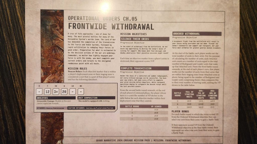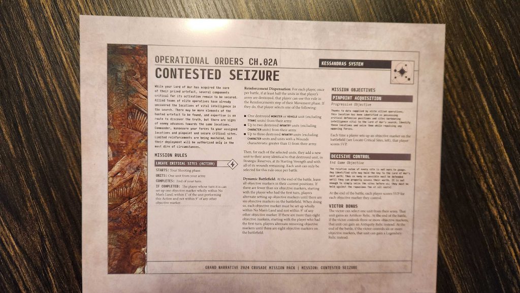 This is one of two missions in the Grand Narrative pack which have players creating objectives to be kept on the table and used later in the third mission. In this mission both players can perform an action to create an objective marker outside their deployment zones, so long as those are more than 9" from any other marker, and players score for creating objectives (5 VP per), and holding them at the end of the battle (5 VP per). This mission also has a special catch-up mechanic, Reinforcement Dispensation, which lets players get back dead units once per battle - either three 1-wound infantry units, two multi-wound infantry units, or one non-Titanic monster or vehicle. This is pretty wild given how much units can differ in size and value - getting back ten terminators or six wraiths is an insane amount of value, as is getting back something like a Great Unclean One. Outside of the reinforcements rule, this mission is otherwise fine. The big hook here is that the objective markers you create stay on the battlefield for the next mission.There was a slightly modified version of this mission for the UK folks, meant to be played earlier in the day - this one was called Critical Path and was largely the same, though with an added rule for giving some units Infiltrators and Stealth.