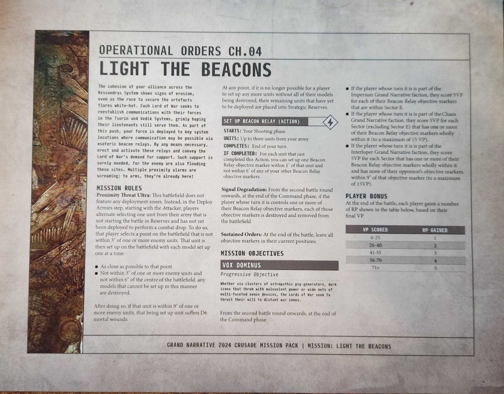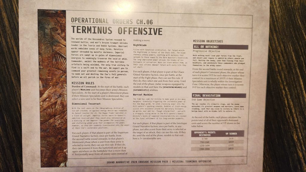 In the final mission we final have a semi-regular deployment map, albeit with Dawn of War Deployment and zones placed 24" apart. In this mission there are six objective markers, and you designate your Warlord as a Mission Specialist. During the mission your Mission specialist acts as a Linchpin, increasing the VP you score for holding objectives from 3 to 5 if they're in the big zone in the middle of the table (a 44" x 24" box around the middle of the table). If your Mission Specialist dies, you can nominate a new one at the start of your Movement phase. In addition to scoring 3/5 VP for each objective you control, you'll score VP for killing enemy units, 5 VP for killing 0-749 points' worth, 10 for 750-1249, 15 for 1250-1499, and 20 if you kill 1500+ points' worth.The big flashy hook on this mission are the faction-specific special rules. Each faction has a special doodad they can activate for a once per game bonus. For the Imperium that's the Dimensional Tesseract, which lets a unit replace its movement with a teleport that puts them anywhere more than 6" away from any enemy units - and with no restriction on their ability to charge. For Chaos this gives a single unit's melee weapons the [DEVASTATING WOUNDS] and [SUSTAINED HITS 2] abilities for a Fight phase. And for Interlopers it's a 3+ invulnerable save for a unit. Xenos get the short end of the stick here, as that Chaos ability just tears through their 3+ but the Imperium faction get the strongest shout, since Chaos already have good ways to get Dev Wounds and being able to zoom across the table and drop outside of 6" with a Knight for a charge is just stupid good. Again, I like the idea behind these but they needed a bit more thought.