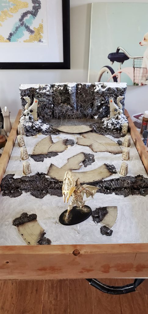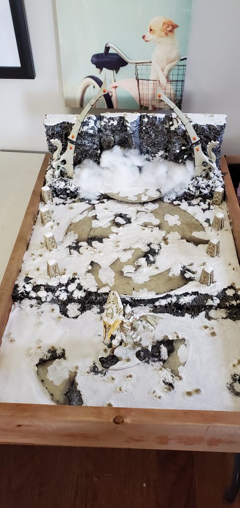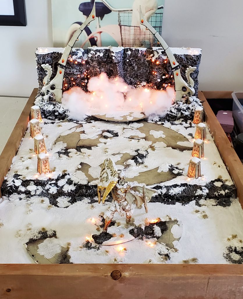 As I touched upon in the hobbying at competitive events roundtable, a display board is an infuriatingly necessary component to a paint judging competition – and the unfortunate reality is that the more impressive the board the more positive the overall impact to your army due to first impressions. So with that in mind I set about to create a board that was both technically and visually stunning as well as keeping with my army’s general theme of snowy/wintry conditions (as befitting a member of the Frozen North). This created several challenges because Eldar and snow really limits your options or forces absurd amounts of creativity around “how did that Craftworld get so snowy?” Fortunately, GW made some fantastic Eldar terrain pieces that you will never convince me were meant to have an in-game purpose: Waygates.