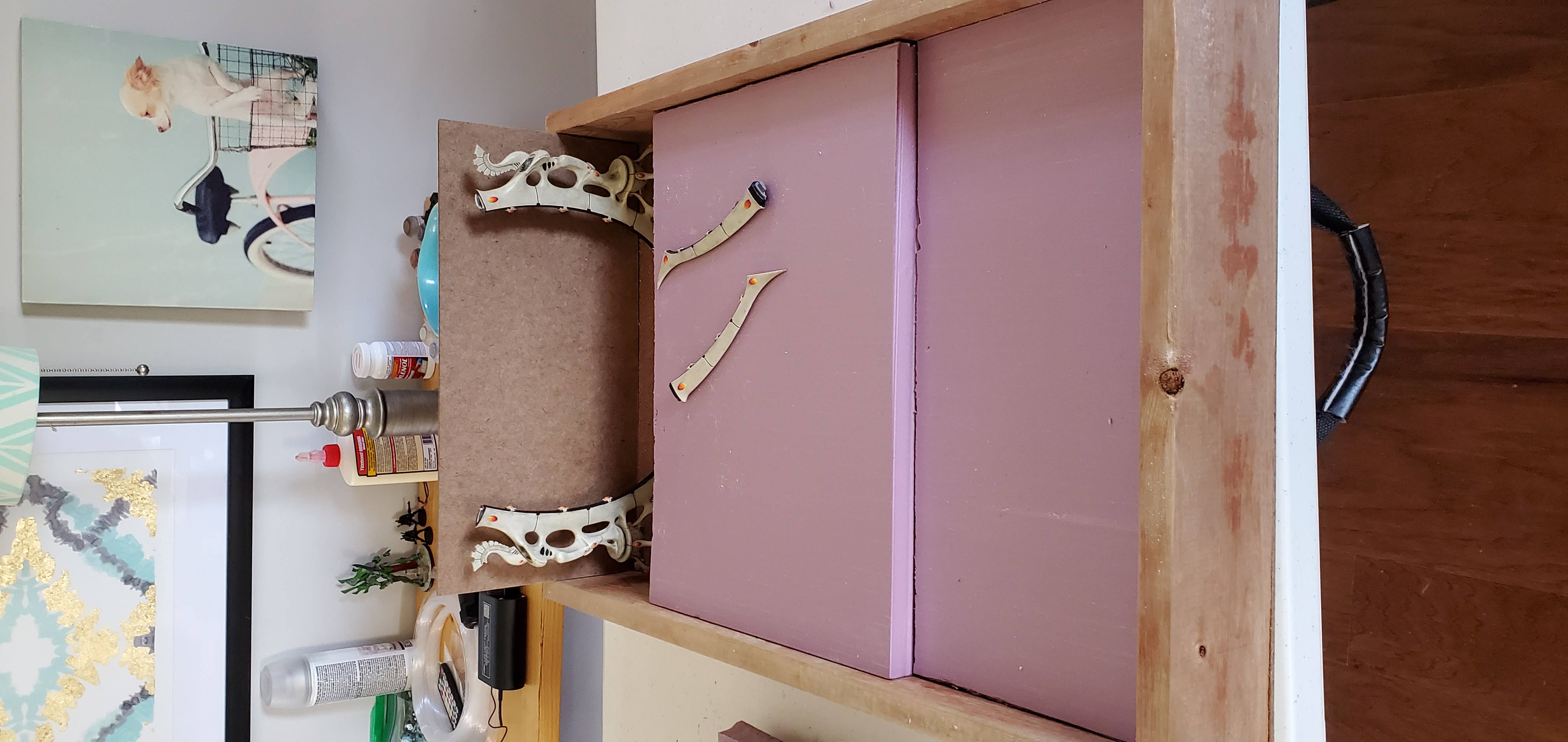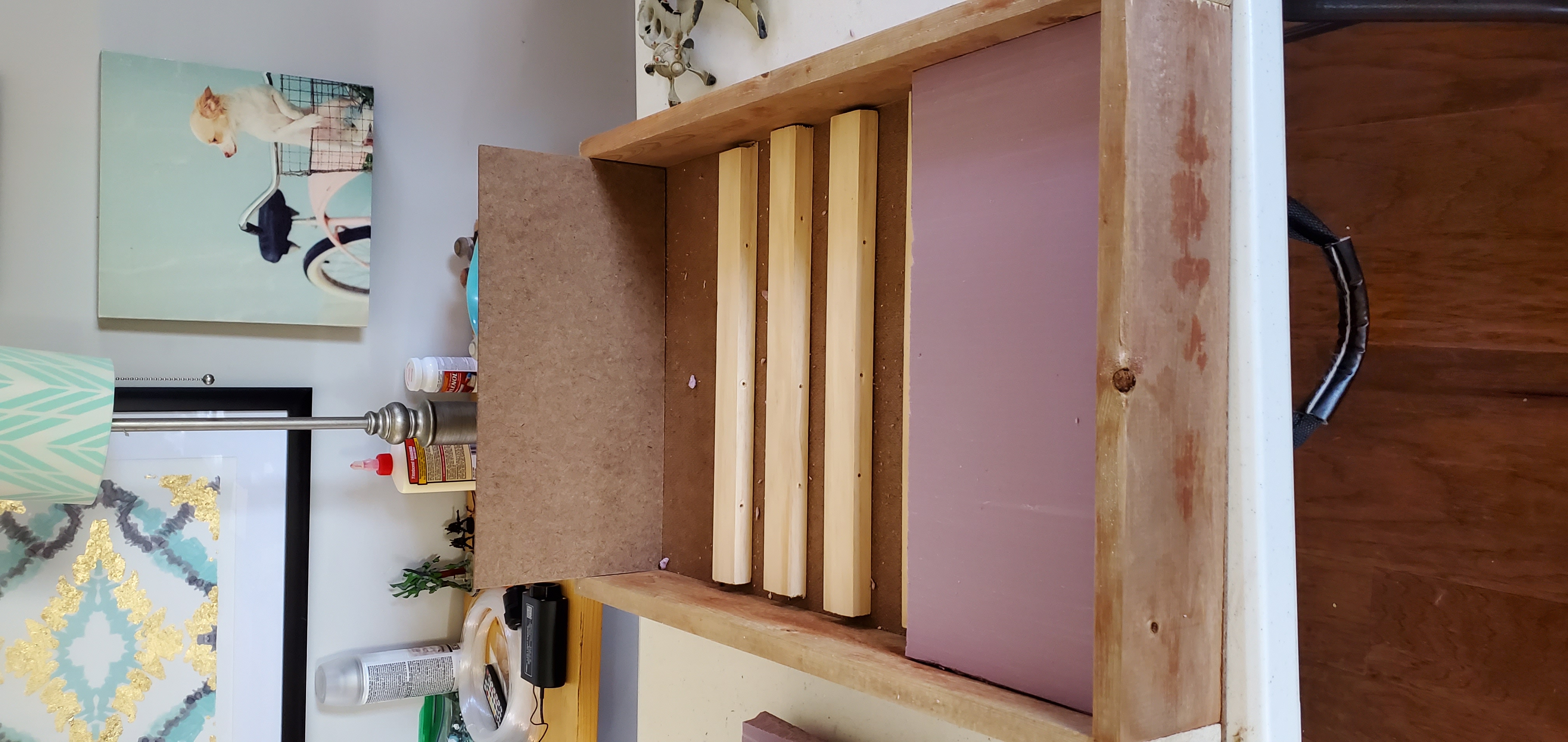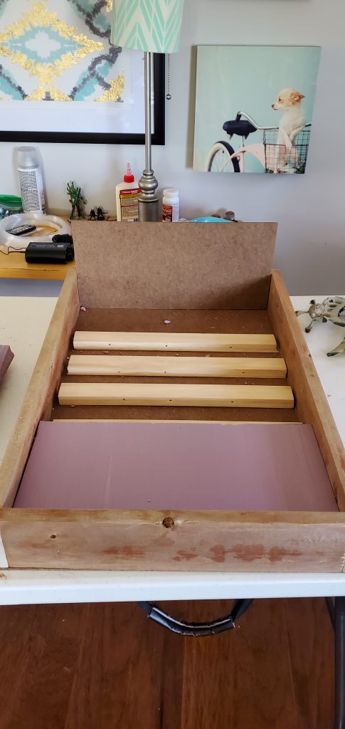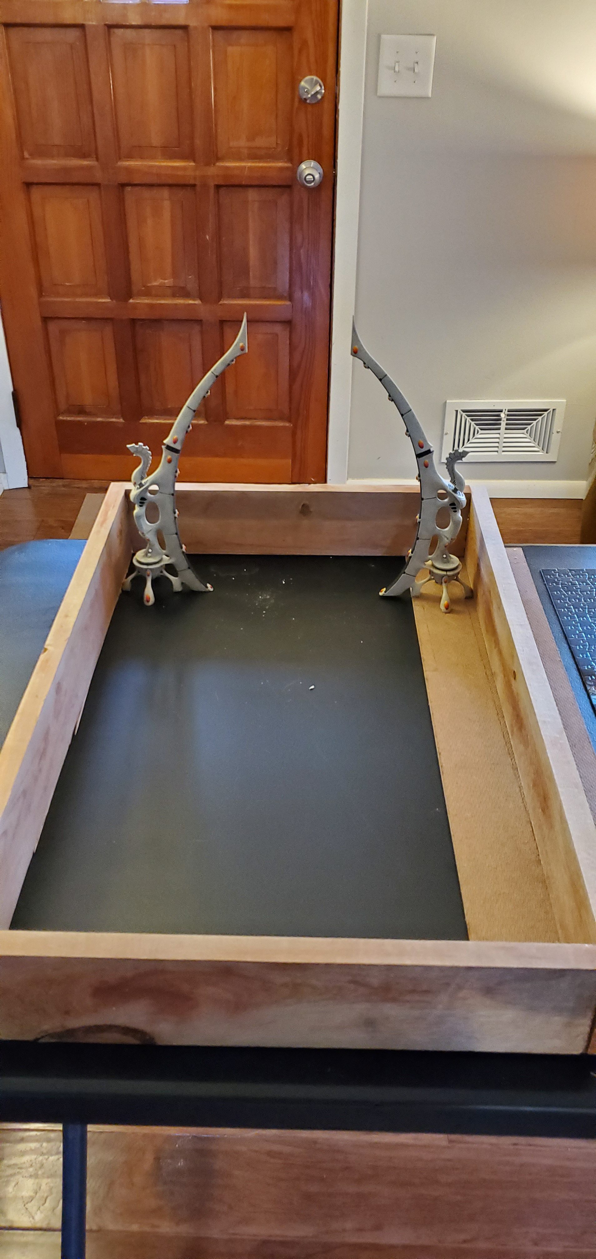 For that reason, I opted for a narrower but deeper board with the interior dimensions 15.5” wide x 27.5” deep (426 in2). It is much easier to carry but does not sacrifice the usable area. I also wanted this to be a board that I could take on a plane – likely as a checked item. While that piece is still being figured out (it is going to require a latched cover), the main takeaway for construction is that the board itself must be durable. I opted for a pine wood frame that is 3.5” wide by 0.75” thick. Pine is light while study enough not to break up with normal handling. Putting together the frame gives me the canvas I need to start planning how I want it to look.