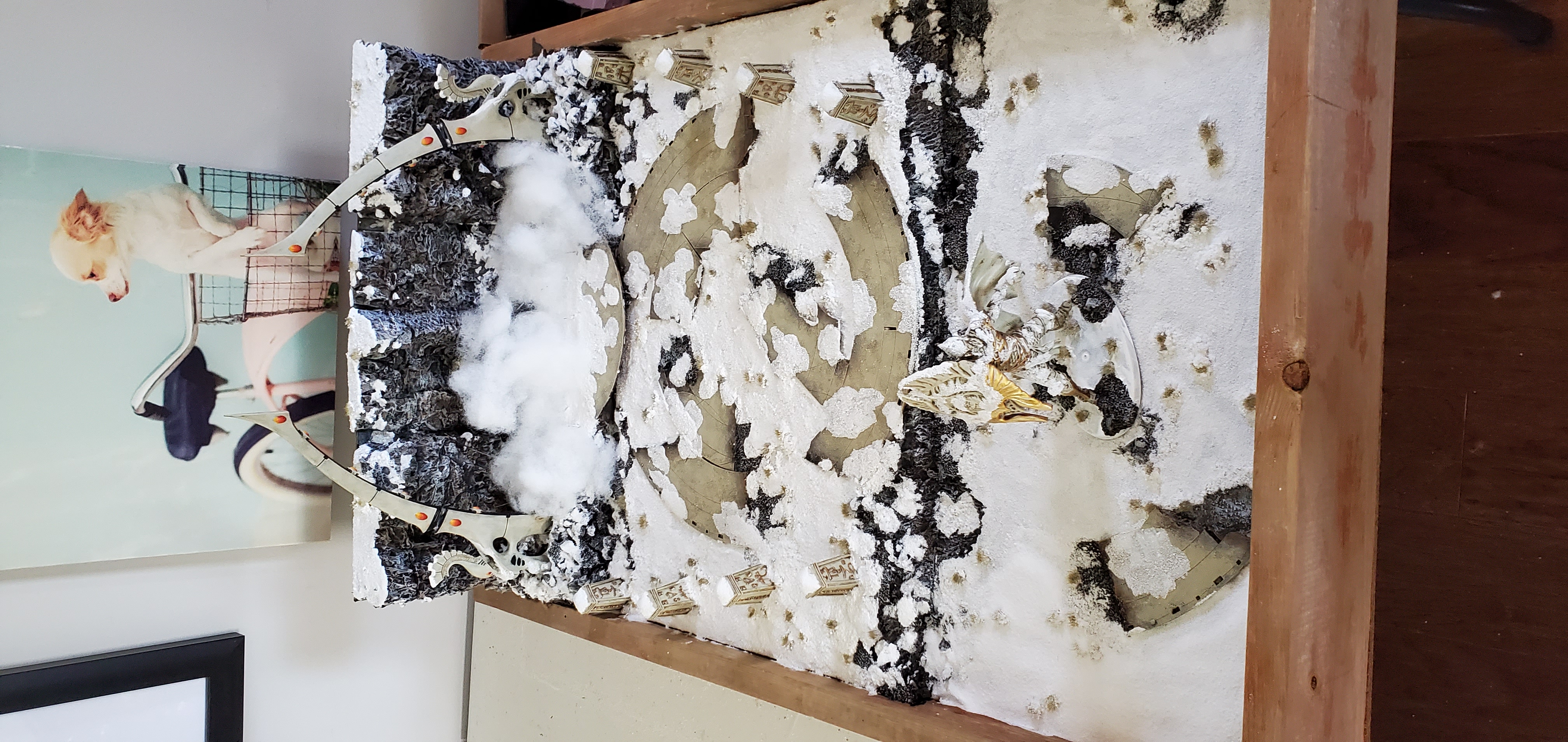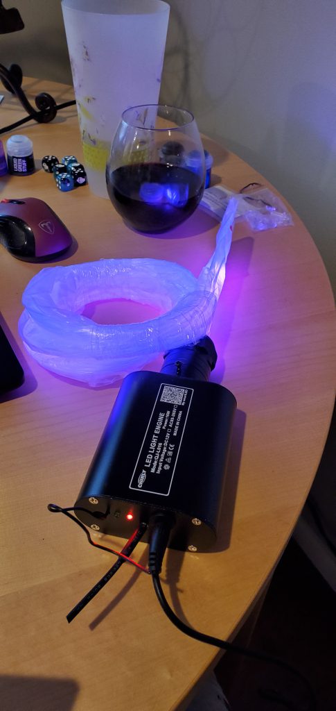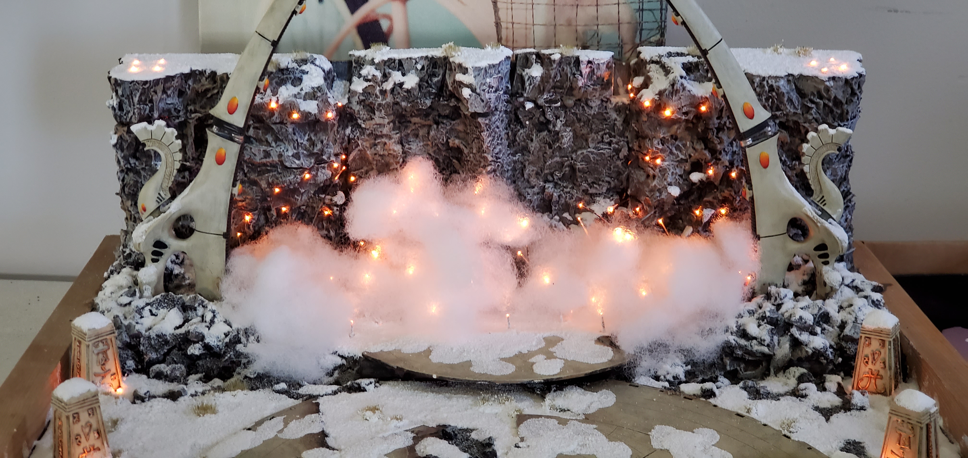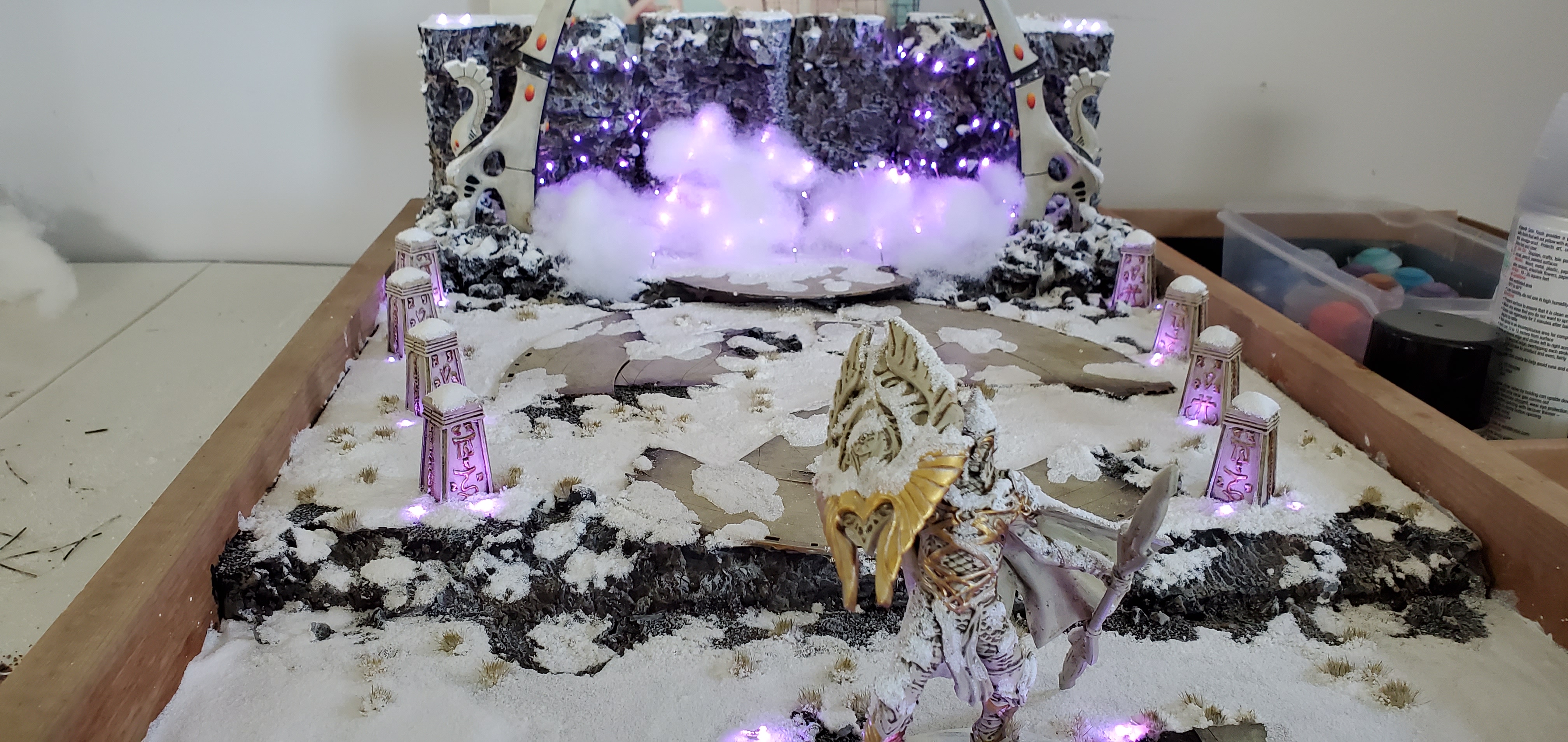 In the end I really liked the look of the cliffs and I didn't want to obscure them - so instead I opted to place the cottony clouds around the base like a fog and let the lighting speak for itself. I also magnetized the arms of the waygates so I can take them off for travel. Some minor work to be done including touching up the magnets to blend into the gate and some areas that need more flocking (I ran out of snow flock) but otherwise I love how it ended up turning out. It took the better part of a month of on and off work but it was a nice break from backlog painting. My favorite part is that the generator can be controlled from my phone and the colors available are essentially anything on the rainbow and a lot effects can be applied to give it a pulsating or breathing look (can even tie it to music!). The goal was to make the army pop and stand out, and I'm happy with where it landed! The biggest takeaway for me was the amount of advance planning and replanning that was required for the fiber optics at each step. Once the foam was in place any rework was going to need a complete gutting and fortunately I did not have to do that.