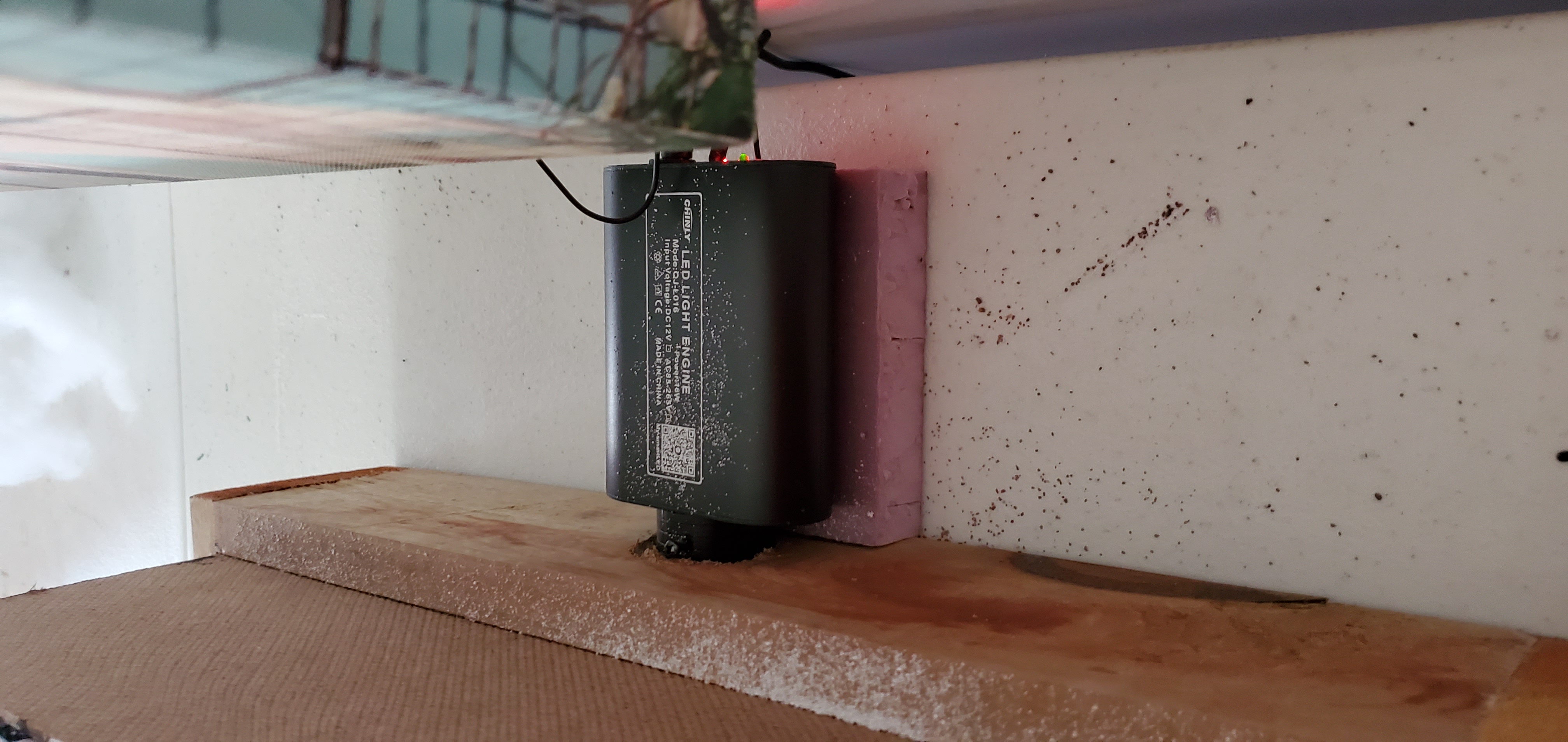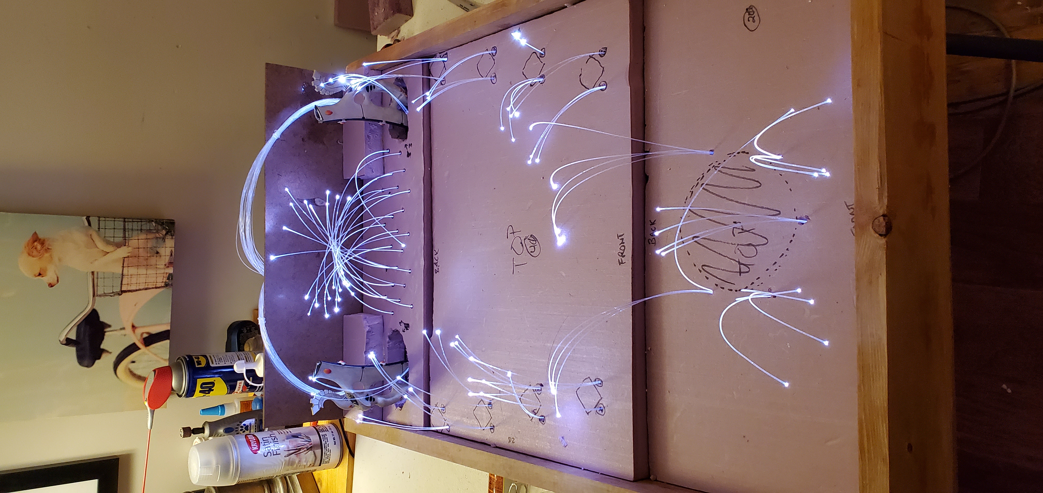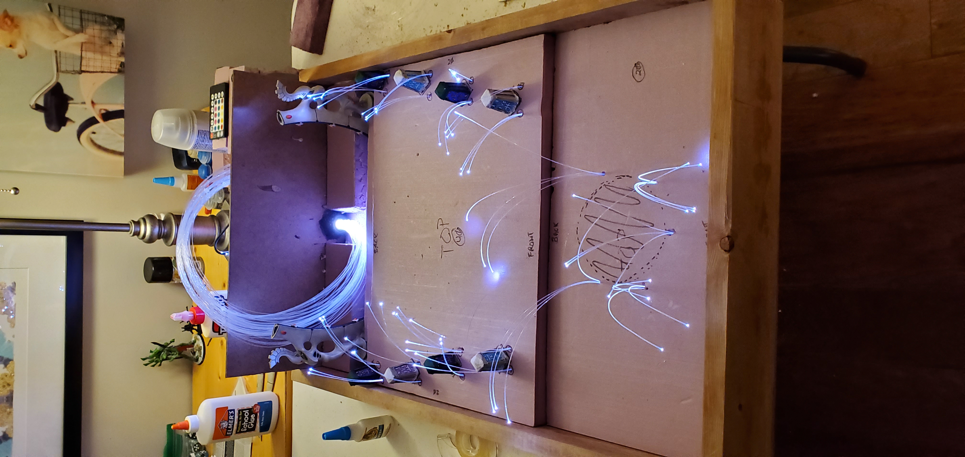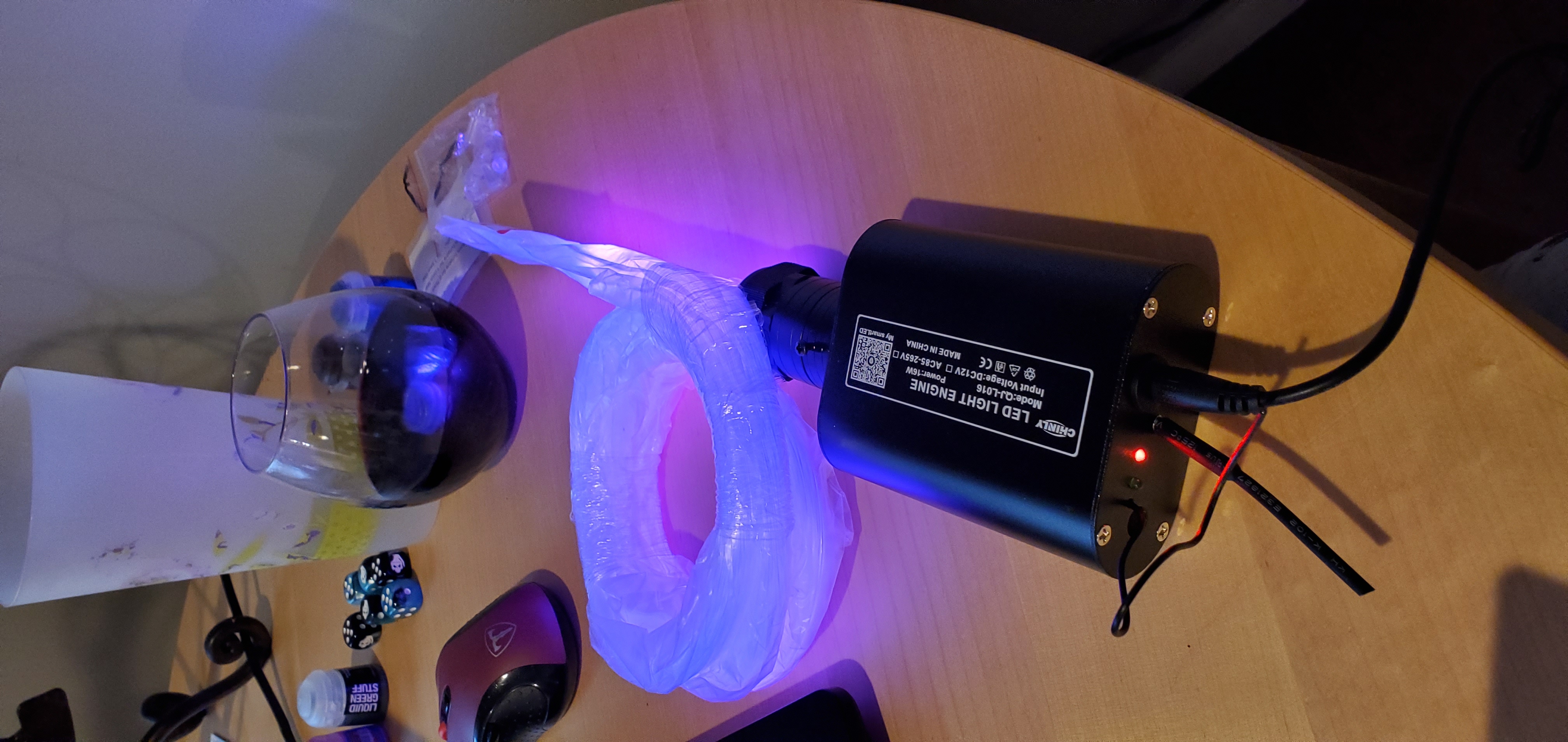 The fiber optic setupThe big decision here was to drill a hole in the frame of the board and place the generator outside rather than mount it internally, either permanently or through some other mechanism. It means that the board requires the generator to be taken with it and set up separately, but it frees up a lot of the space inside for the fibers (which take up a lot of space in the bundle) and also keeps the heat down inside the board. Also, as the fiber bundle is at the end of the board, basically any light source will work here - if I forget the generator or don't have access to a power outlet/extension cord then I can simply place a flashlight against it to achieve the same effect.