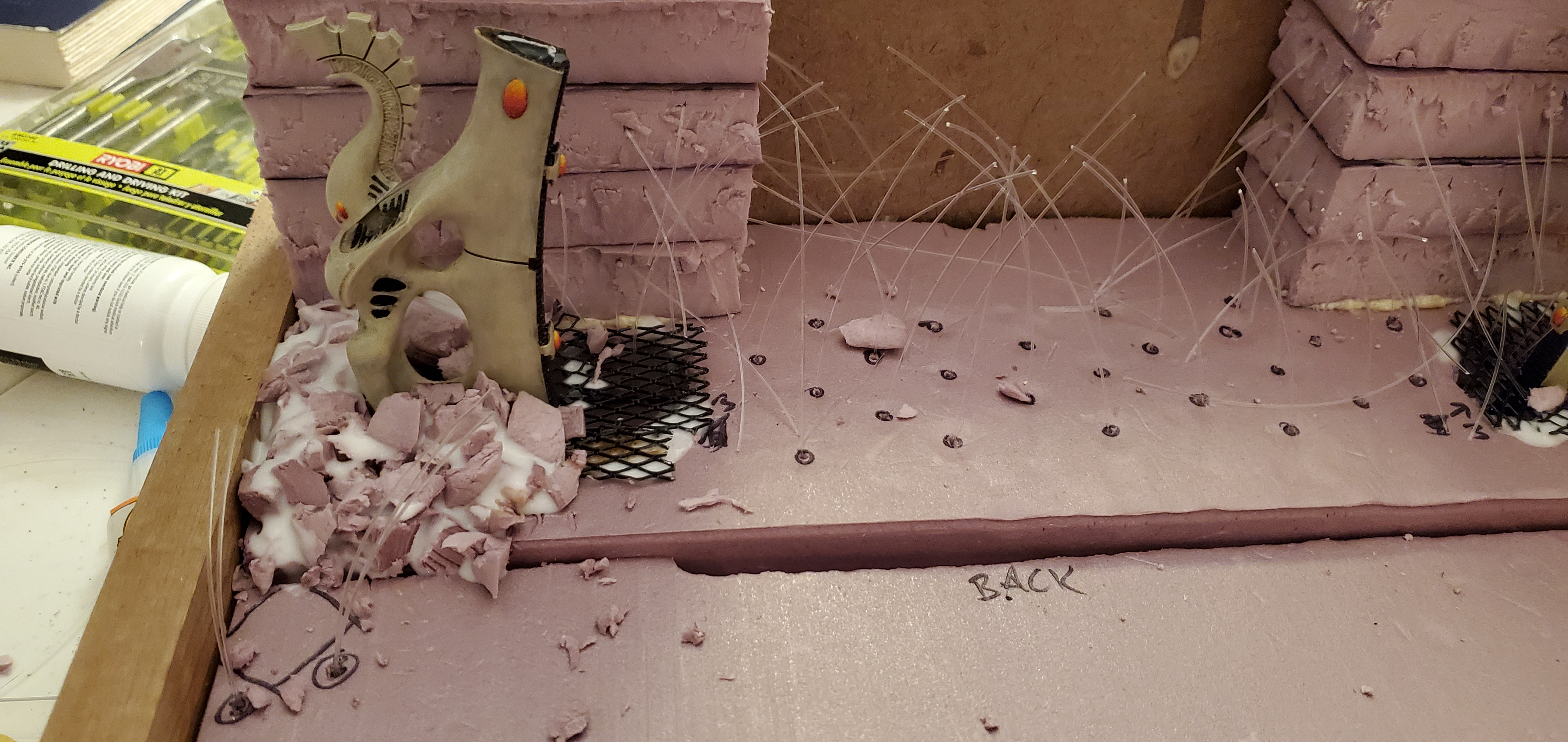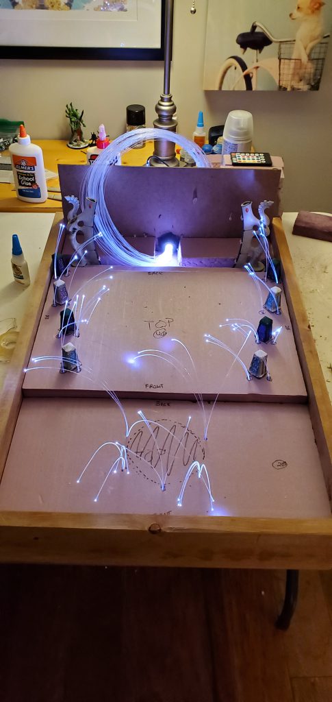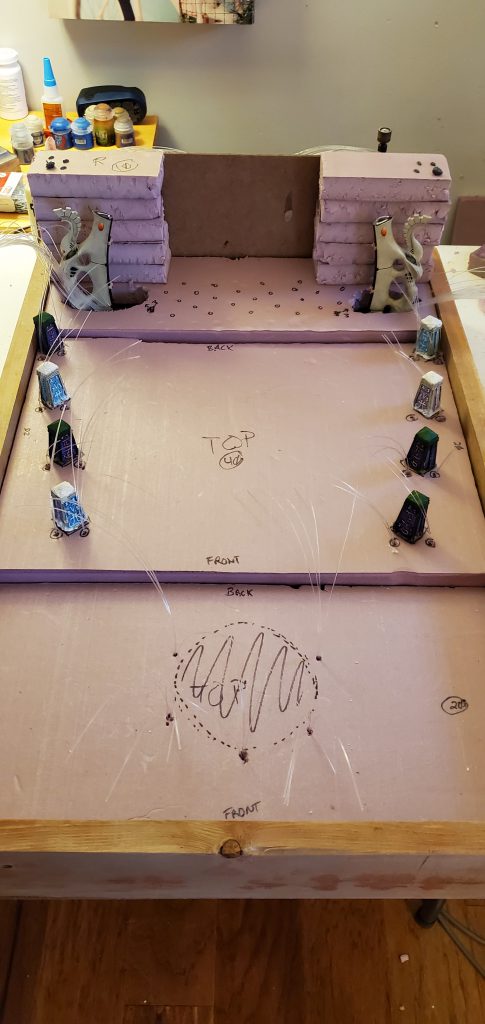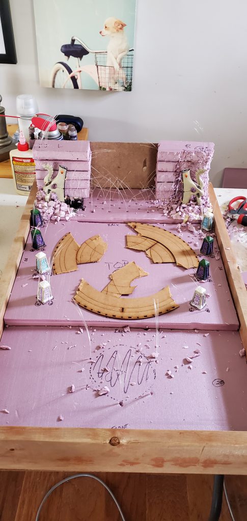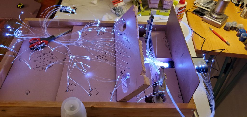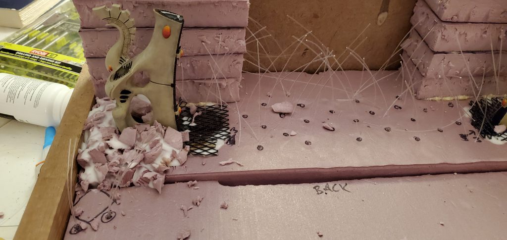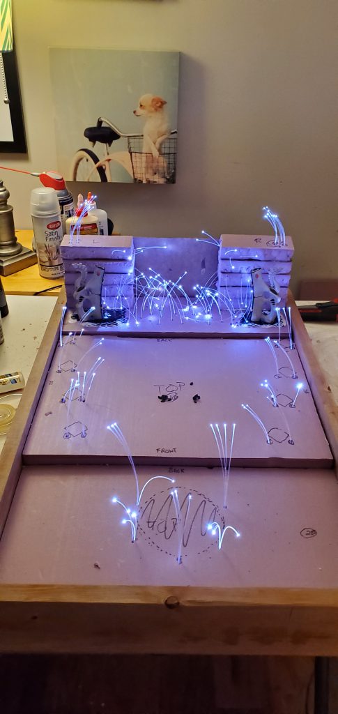 With some sketches in hand and a vision in mind, I began to think about how the fiber optics would be housed. I quickly realized that I wanted the light to be available throughout the display not just at the waygate itself which means running strands through the length of the board. Going back to the sketch pad I laid out how I thought the strands should be divided up and why/where. With Lord of the Rings or the picture of the Avatar and the Court of the Young King on my mind, I figured statues could line the ‘ramp’ to the waygate or be installed in the cliff face itself. Looking at my options I found some old obelisks that I purchased as a ‘what if’ like a decade ago that fit the bill for decoration to ‘line the path’ and a few resin statues that could stand in for aelf warriors of legend. With some general layouts in mind I began to cut the foam base and draw out and lay the fiber accordingly.
