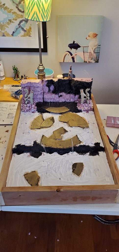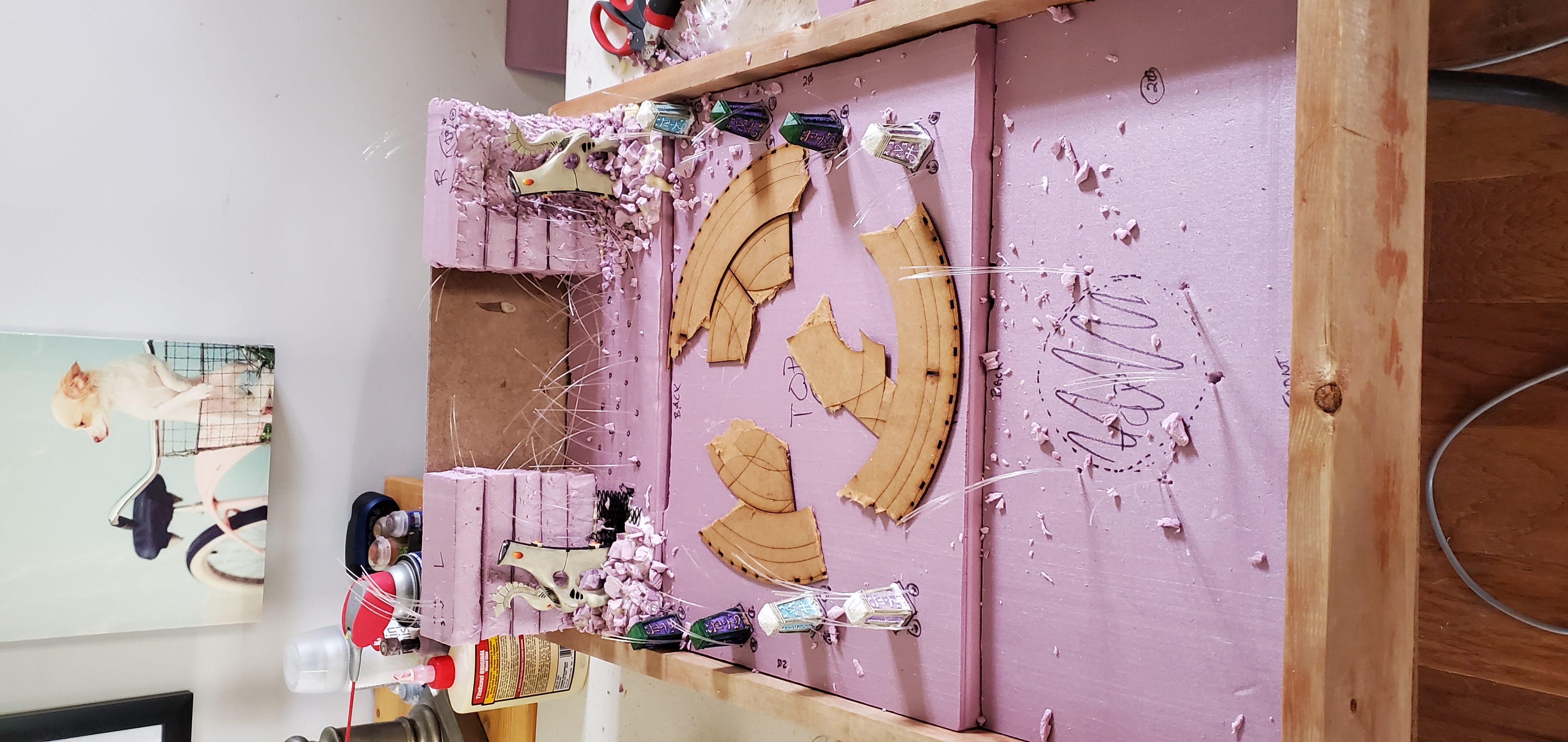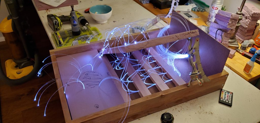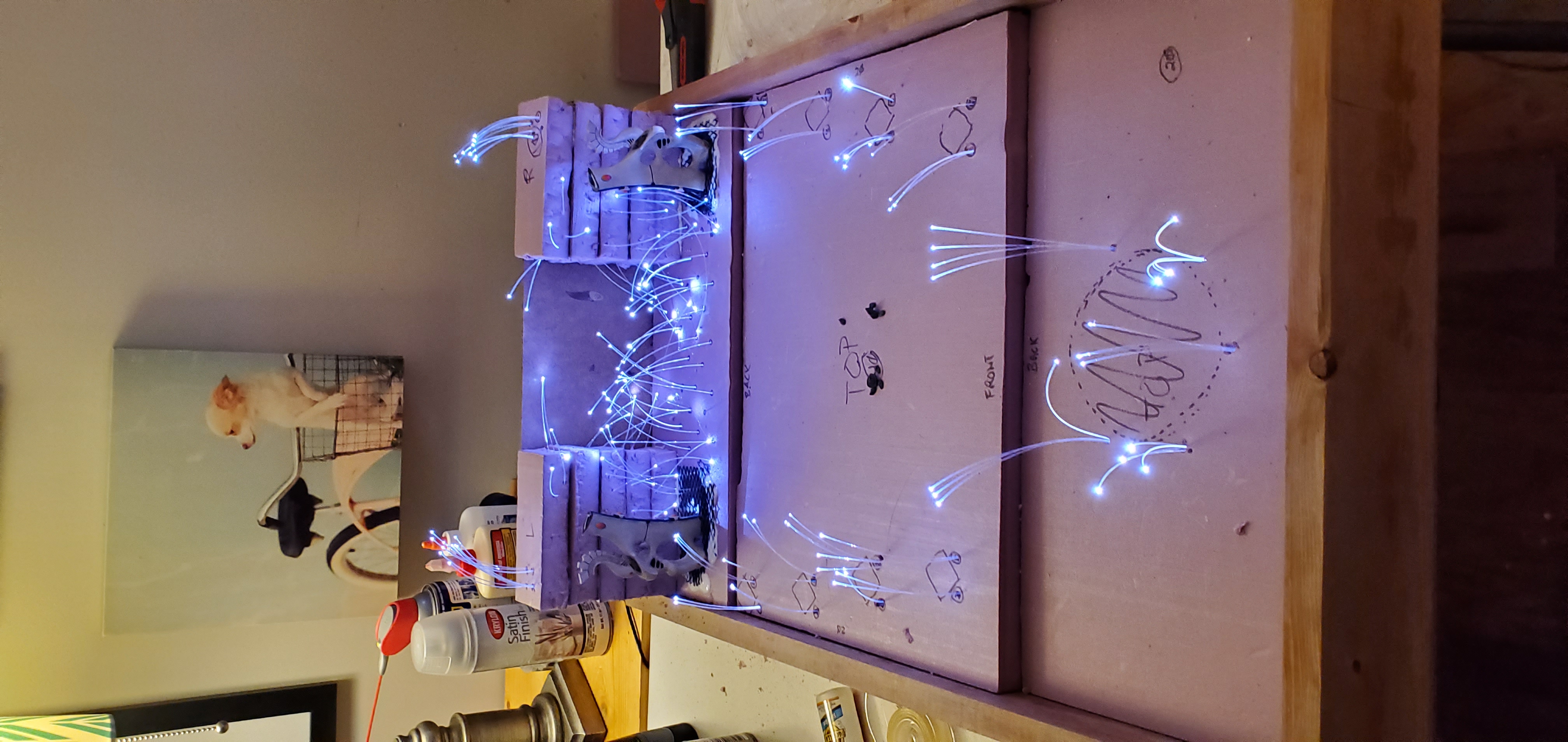With some sketches in hand and a vision in mind, I began to think about how the fiber optics would be housed. I quickly realized that I wanted the light to be available throughout the display not just at the waygate itself which means running strands through the length of the board. Going back to the sketch pad I laid out how I thought the strands should be divided up and why/where. With Lord of the Rings or the picture of the Avatar and the Court of the Young King on my mind, I figured statues could line the ‘ramp’ to the waygate or be installed in the cliff face itself. Looking at my options I found some old obelisks that I purchased as a ‘what if’ like a decade ago that fit the bill for decoration to ‘line the path’ and a few resin statues that could stand in for aelf warriors of legend. With some general layouts in mind I began to cut the foam base and draw out and lay the fiber accordingly.
