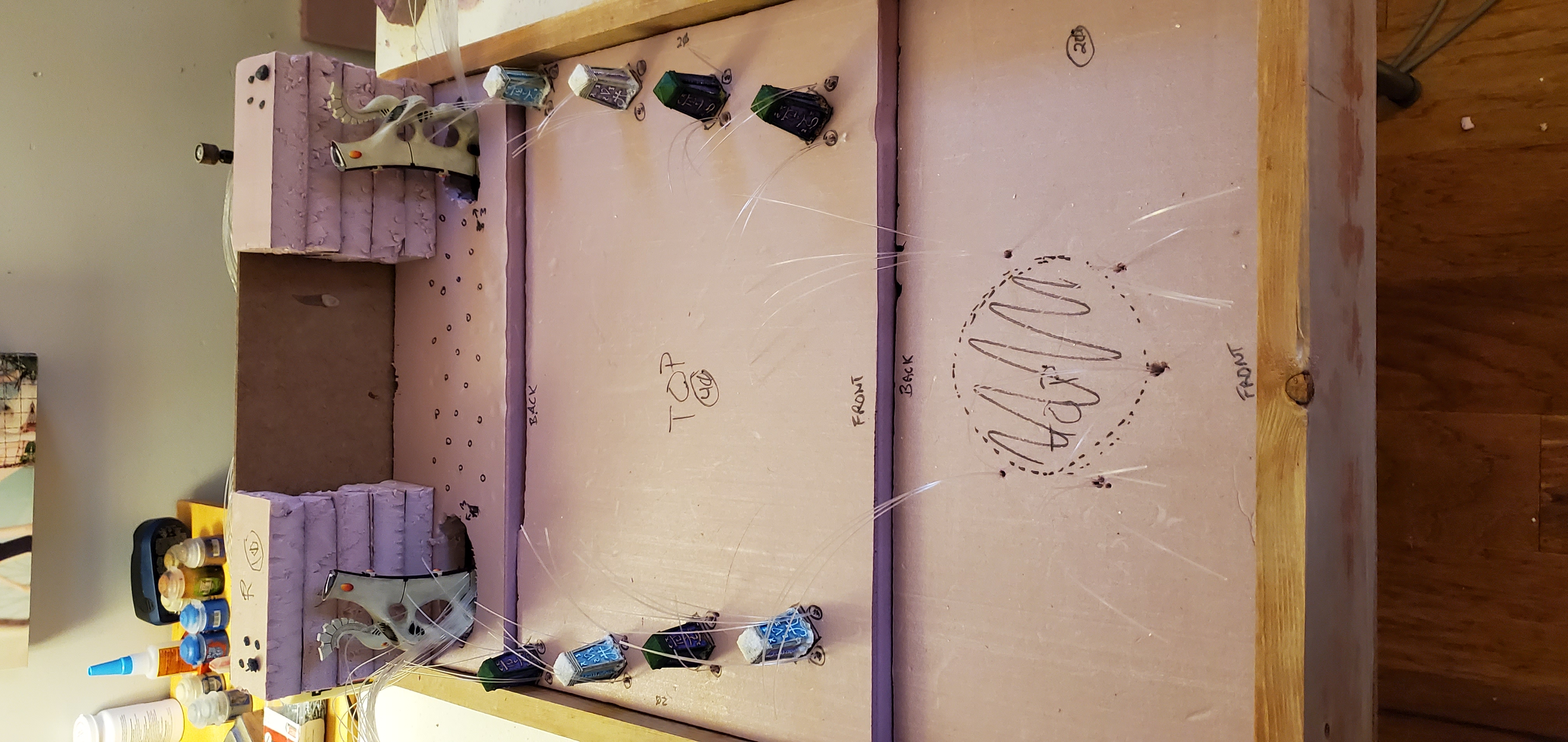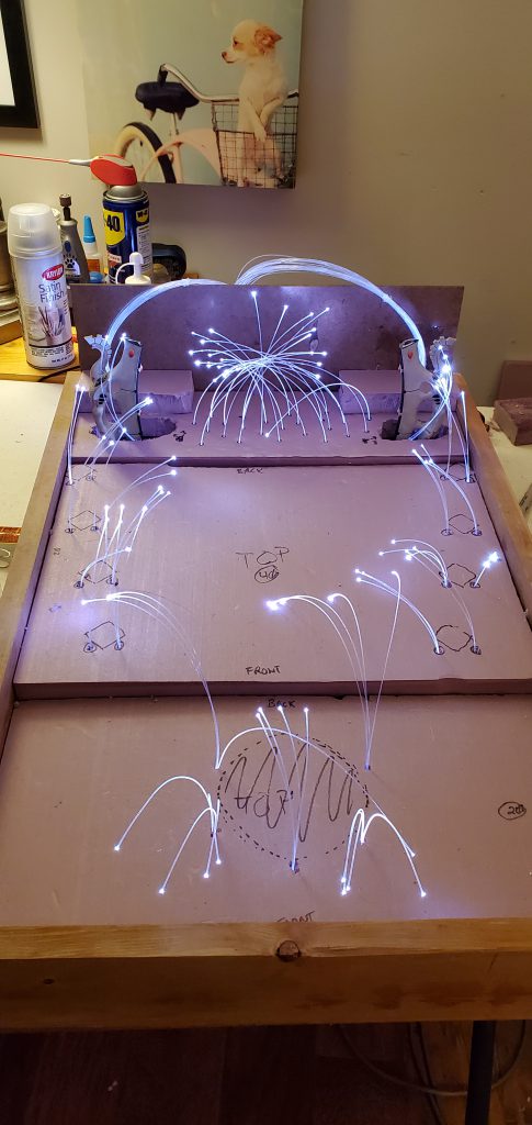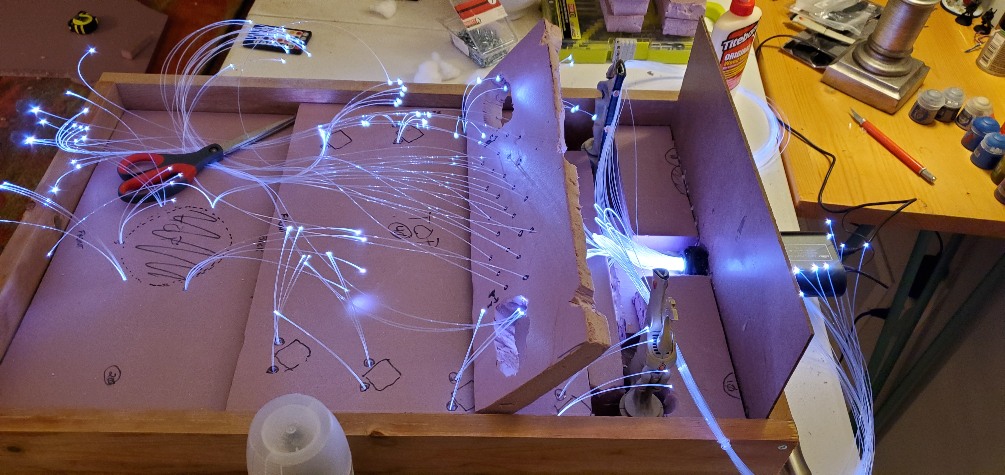 Let There Be Light!The next thing was designing a concept that maximized the area while also ‘made sense’ in terms of the theme of the board. As I mentioned, a waygate makes a natural tool to divide worlds. Raised platforms also add usable surface area while not adding increased size to the board. I sketched out some concepts of a waygate built into a rock cliff wall where the gate itself opened to a Craftword parade ground. The idea being that I could model in a craftworld interior into the back end of the board and then surround that by cliffs as the waygate breaks to the current world environment. While nice, that seemed overly intensive and fraught with risk. I sketched up another idea where instead of hollowing out the central cliff areas I would use a representation of a webway tunnel including foam and lights. That led me to think about lighting more seriously and what I could really do with it. If the board was going to be durable it would need to avoid requiring bulb replacements or risk knocking around. That meant LEDs, fiber optics, etc. I chose fiber optics because, while a little more intensive and challenging, they don’t require any kind of maintenance – all they need to work is a light source. Further, they can be anchored solidly in place which speaks to the durability component I need from this board. The advanced fiber optic systems are a little pricey, but they offer some nice features (multiple settings, color shifting, phone remote control, etc).