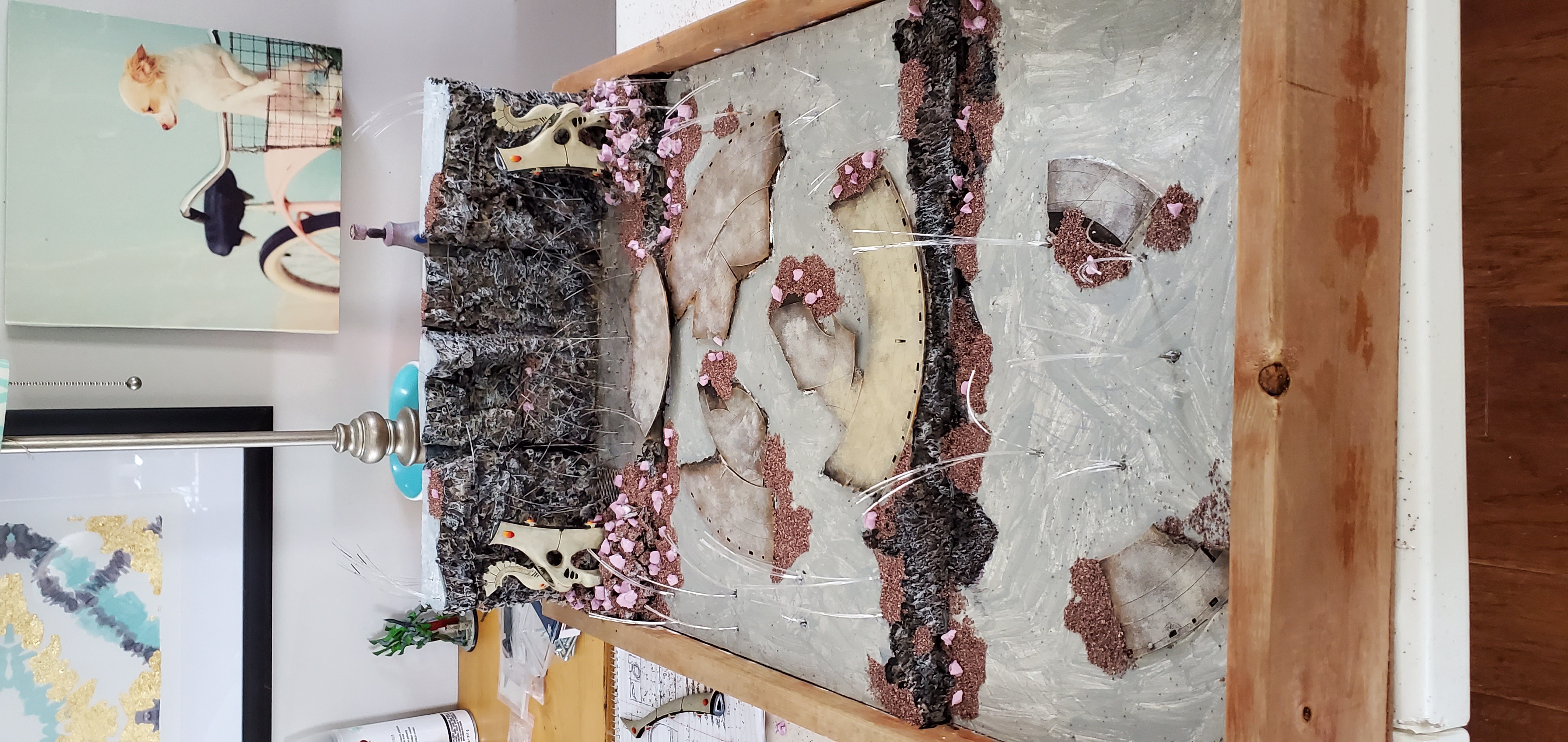 With the fiber optics all placed I felt like I was 50% there. I was also extremely nervous because at this point a lot had been invested into the board in terms of time and material. The waygates were more or less permanently mounted and I was concerned that messing up the fiber by cutting poorly or messing up the facade would ruin the whole thing. Trying to envision how I was going to handle the 'portal' it wasn't clear to me and I quickly realized that I did not leave myself enough room to really carve out a view of a Craftworld or anything else (refer back to my first piece of advice about making sure you have enough surface area). So instead I figured I'd fill in the blank area with additional cliff face and then use cottony clouds backlit by fiber optics to visualize a swirling portal of the webway tunnel.