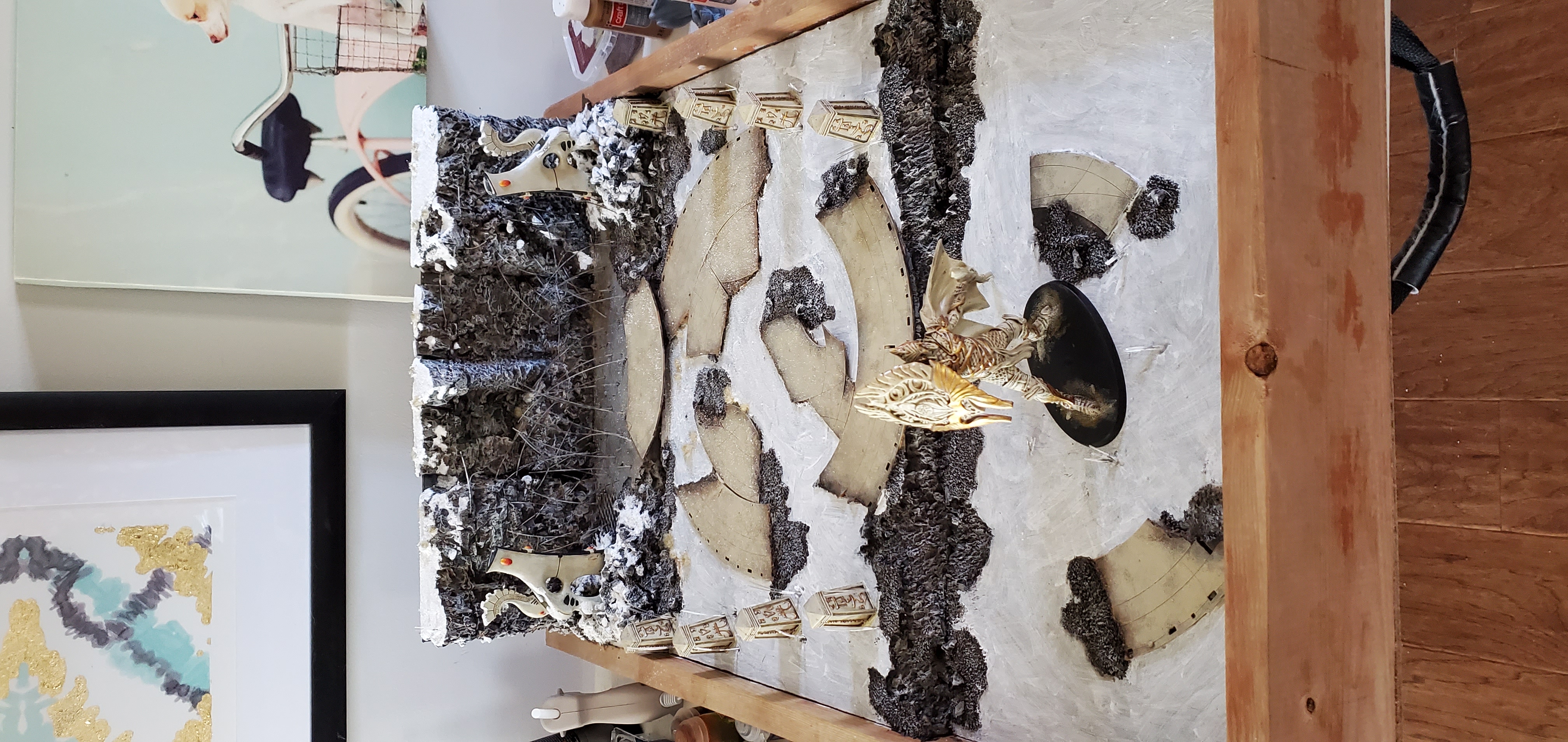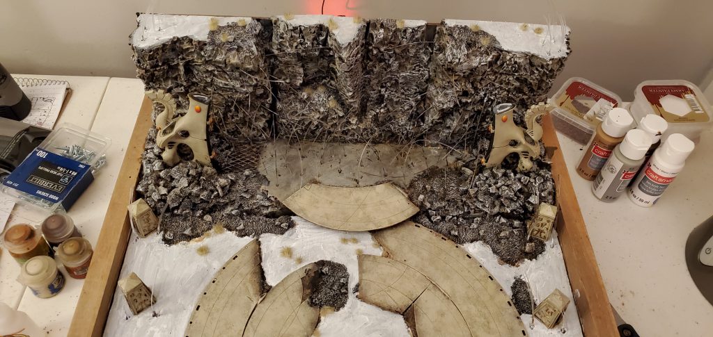 Added a broken up mdf piece from an old terrain kit I found - last minute add but it makes a nice addition to break up the large flat area - you can start to see the work on the cliffs to the right