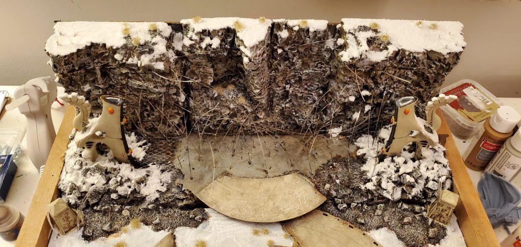 Starting to finish off the terrain - adding grass tufts and snow flocking the cliffs