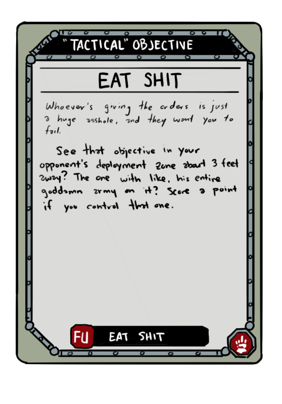 This leaves players with 29 objectives to pick from given that they can’t double up on “Secure Objective X” cards. That should be few enough to allow for some variation, and to allow players to prune their decks as needed before each game. Or you could consider forcing players to take a “base” deck of six Secure Objective X cards, leaving them 23 choices to fill the remaining 12 slots. Either way should allow the deck to function something like ITC secondaries, with players adapting their deck to their opponent and the game at hand.