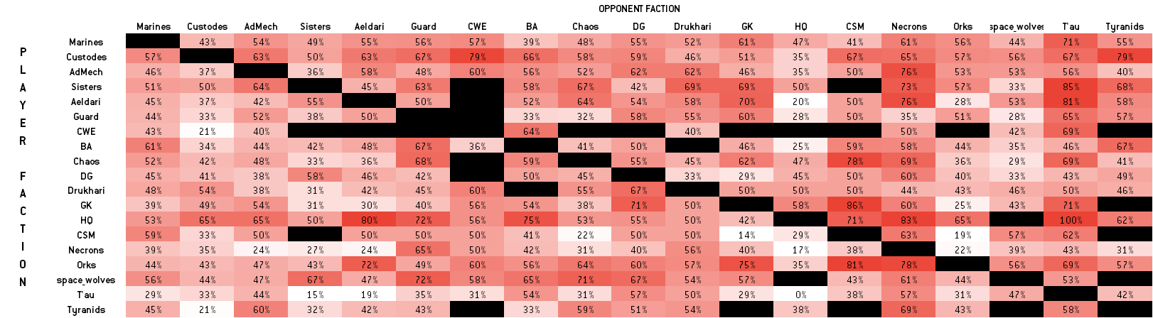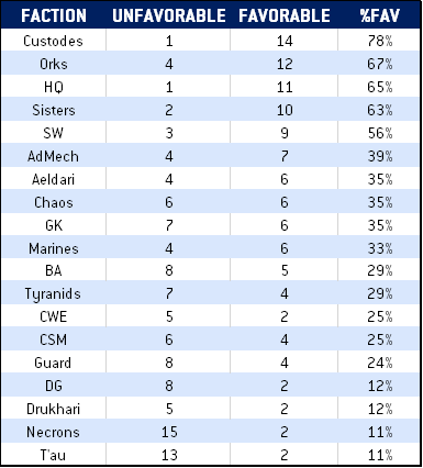 So with that bit of context in place, let’s look at the win percentages for each faction to see what that can tell us about the relative power of 9th edition factions.
