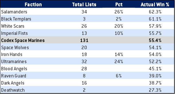Using 40kstats data, we can dive into the marine chapters and how they might be contributing to marines’ overall scores. Non-codex chapters have been included on the chart below, although they aren’t included in the “Codex Space Marines” average.