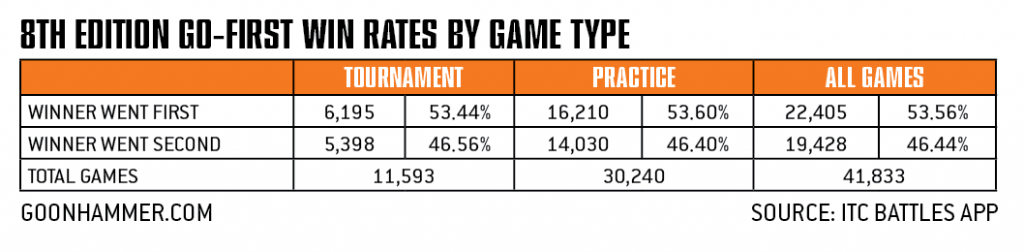 Well, turns out that while 8th edition games did confer a slight advantage for going first, it wasn’t nearly as pronounced, with the player going first winning about 54% of the time and that effect potentially being depressed at higher levels of tournament play, where better tactics could potentially mitigate the impacts of an alpha strike.