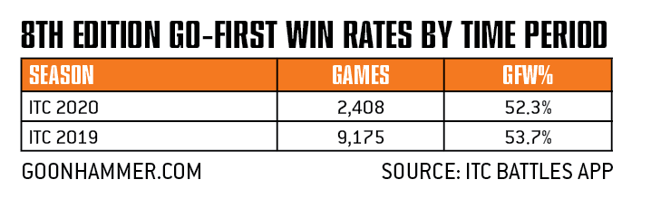 But how do these win rates stack up to 8th edition? Something we’ve debated internally is whether this represents a significant change from the prior edition, particularly when compared to the changes brought by the 2020 ITC tournament pack that was unveiled following the Las Vegas Open. We’d already heard from several great players, including Richard Siegler, that they’d choose to go second. So How did things look in 8th? Do things just feel really off or is there an actual difference?