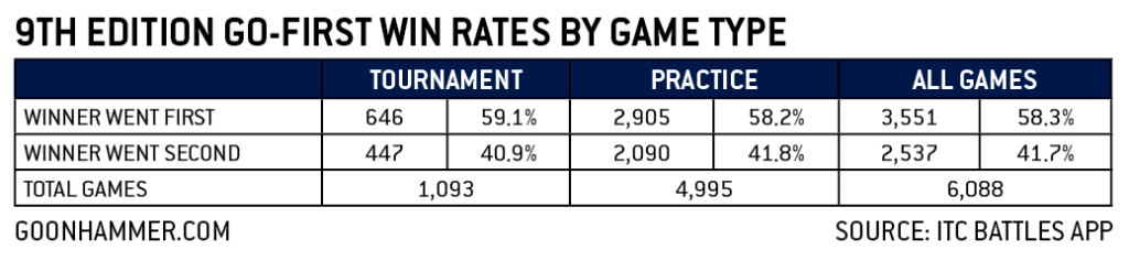 With a larger sample size of data (6,088 games) from the ITC Battles app, we can now say with much more confidence that, yes, going first represents a significant advantage in 9th edition.