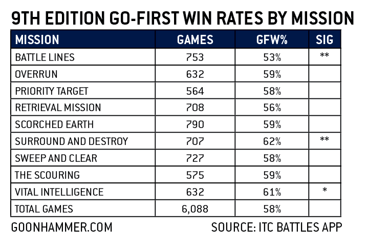 Now we’re talking. On the whole, most of these aren’t significantly different from the baseline 58% go-first win rate for 9th edition overall, but we have two notable outliers, where there is a significant difference - Battle Lines, which has a 53% go-first win rate, and Surround and Destroy, which sees the player with first turn winning 62% of the time. At a lower confidence level we have Vital Intelligence, which also sees elevated go-first win rates. You may recall that the Iron Halo GT had Vital Intelligence as its round 6 mission, and the go-first win rates we saw there lined up pretty closely with this result.