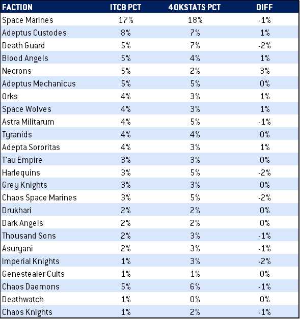 There are two things to note here about the ITC Battles app data: The first is that it doesn’t break out Space Marines/Adeptus Astartes armies by subfaction. This is unfortunate, since we’re pretty sure there’s a wide gulf of strength between the top marine chapters and the bottom ones (more on that in a bit). The second thing is that ITC Battles app data represents a much larger group of players and events (such as leagues and RTTs), and as a result will include weaker lists and players overall, but also a wider variety of potential lists, since it’ll include test games where players are trying things that wouldn’t necessarily make it to a GT.