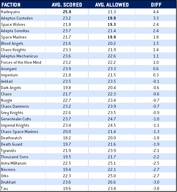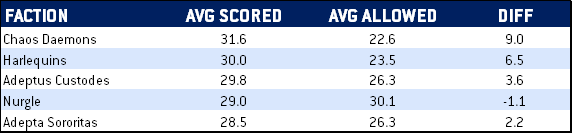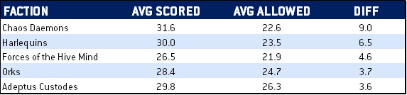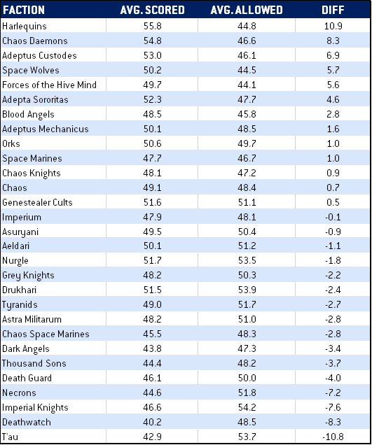 Here's the thing: The good factions win more games, so they have to be good at both scoring primaries and secondaries, and the bad factions have to be bad at both. So what we really want to look at is that differential - who's scoring more while giving up more, vs. who's scoring blowouts. I went ahead and sorted the results by points differential and while most of these weren't a shock, Drukhari, Genestealer Cults, and Tyranids suddenly rocketing into the top 6 was interesting.