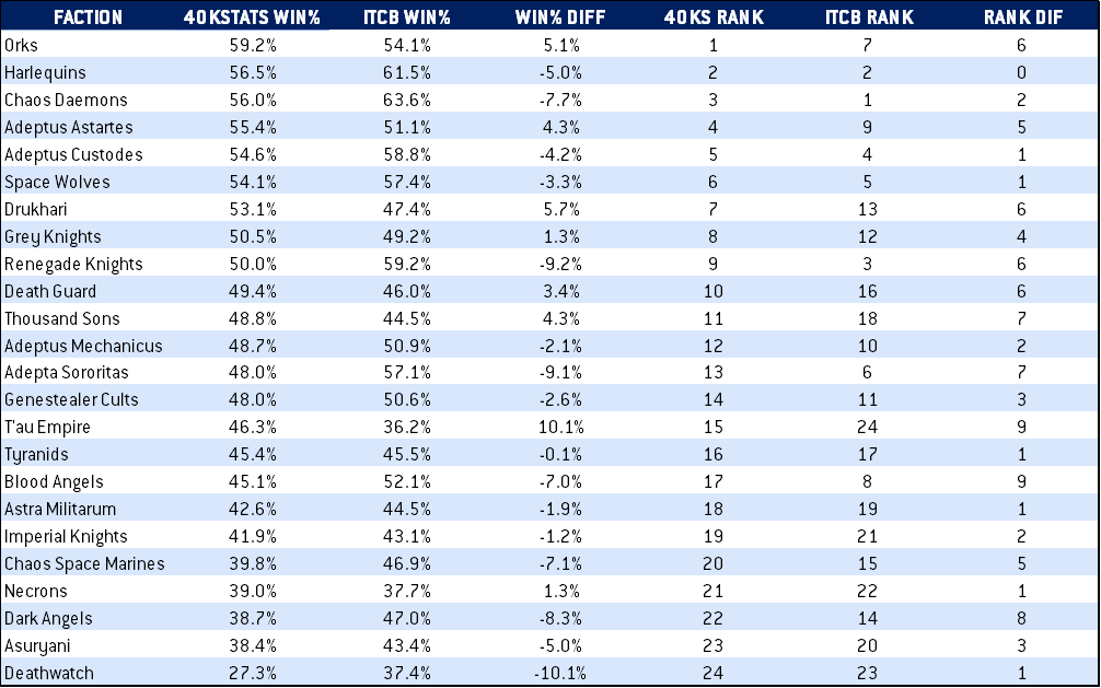 Our own inestimable One_Wing has been doing a fantastic job covering the cutting edge lists of the 9th edition tournament scene, taking a microscope to the top 4 lists of major events and talking about how we see faction tiers in 9th edition. Some of that was based on the data we’ve been compiling here, and so here we’re going to take another look and go even deeper into the stats behind faction performance, both in the ITC Battles app and with 40kstats’ events data.