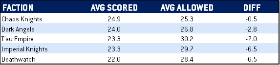 Marines and Orks fell just outside of this, with Space Wolves having the best showing (some of this may be due to ObSec everything for a time). On the other hand the bottom five shows us that knights and T'au are really bad at capturing and holding objectives. Thousand Sons fell just outside this bottom five, and they're likely in the same boat as Deathwatch as "an elite army that isn't all that durable."