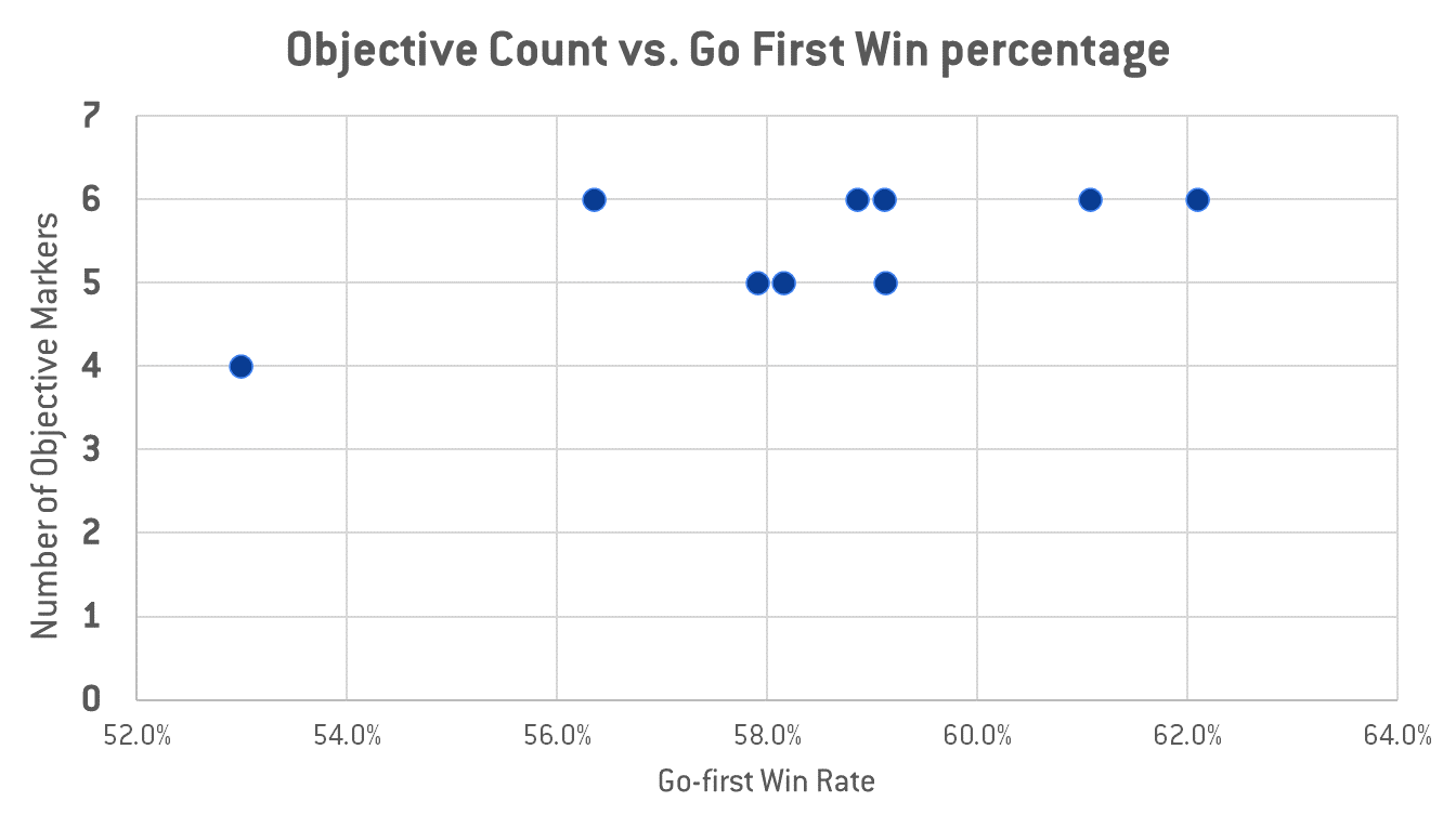 Of these, only the total number of objective markers on the mission had significant explanatory power, with the number of objectives explaining about fifty percent of the difference in go-first win rates for missions (r-square value = .502). This makes sense, given that Battle Lines is the only mission with four objective markers, and that the 6-marker missions tend to have higher go-first win rates.