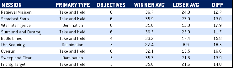 We've talked about mission impacts on go-first win rates and seen some effects there, but how do missions affect primary scoring? Well, the big one is that Domination appears to depress primary scoring. This isn't a huge surprise, but on average, primary scoring for Domination missions (where players have to hold two / three objectives to score points as opposed to one / two in take and hold missions) is about 11 points lower on average, particularly on The Scouring, which combines Domination with a smaller number of objective markers (5).