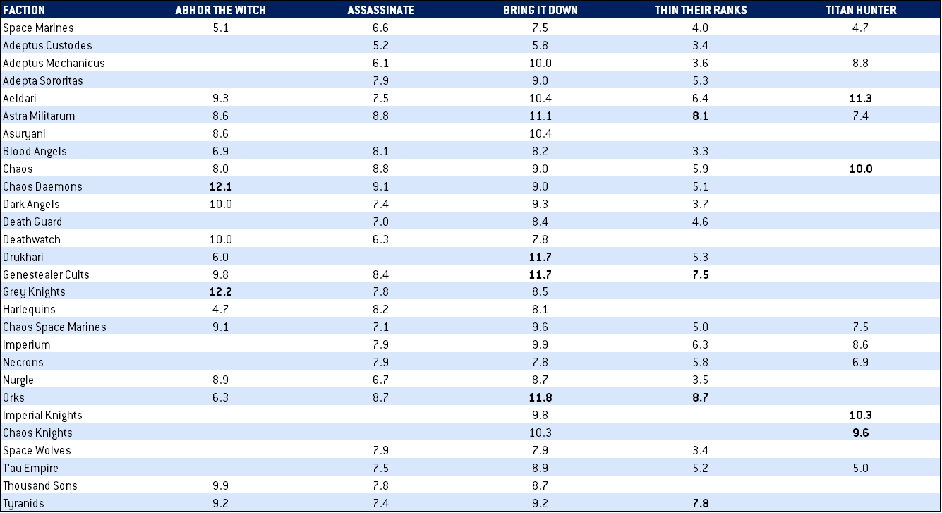 Here's where we can see the construction effects at play - Grey Knights have no choice but to give up easy points for Abhor the Witch - an average of 12.2 per game - and Chaos Daemons are in the same bucket. Meanwhile Astra Militarum are giving up 11.1 points to Bring it Down and 8.1 to Thin Their Ranks in an average game. The only deeper hole here is the one Orks dig, but we've talked about how they score on primaries. The Adeptus Mechanicus likewise reliably give up 10 points per game on Bring It Down, but don't suffer nearly as much on the other kill-based secondaries, unless they have the Questor Mechanicus tagging along. Unlike the others, Assassinate tends to be a pretty consistent secondary, with only Custodes being able to shrug it off - Note to Self: Do not take Assassinate against Custodes. It's also a bit more brutal for Daemons.