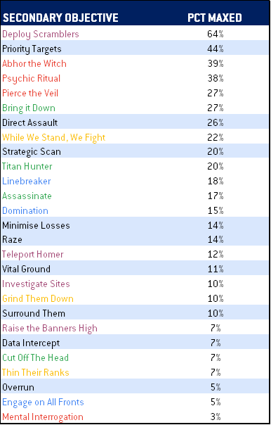 - Deploy Scramblers is a bit obscured in this table as it’s an all-or-nothing secondary that maxes at 10 points - the reality is that the average of 6.5 tells us that in 65% of the instances it's taken it scores the max which is a bit different from our other objectives and also gives it a lower overall average comparatively. This is a secondary where a player must ask themselves how reliably they can score it - it may very well be an auto-include despite it’s middling average on this list.