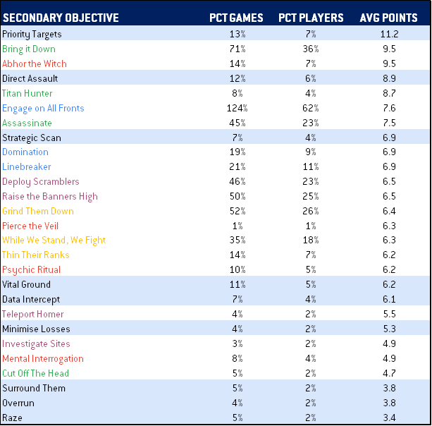 - Priority Targets is really good. While on the whole, mission secondaries tended to be really bad if not downright awful, Priority Targets consistently results in the most points scored per game of any secondary. If you're playing Priority Target, you should consider taking this secondary. Direct Assault (Sweep and Clear) and Strategic Scan (the Scouring) also seem to be decent value as secondary picks, and are worth consideration.