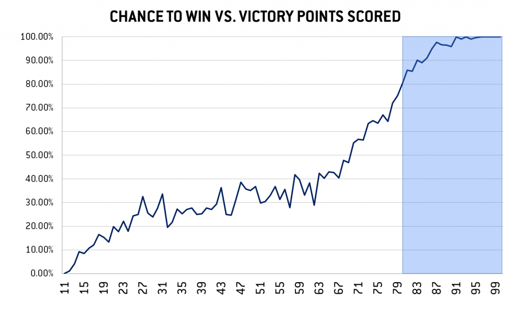We talked about this last time, but generally speaking, wins tend to occur when a player scores 80+ victory points - at that number you have better than an 80% chance of winning.