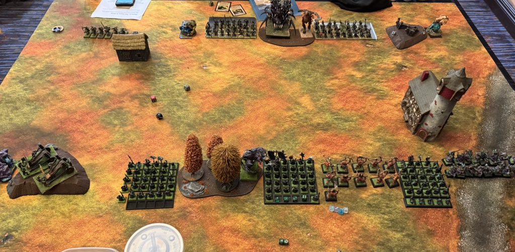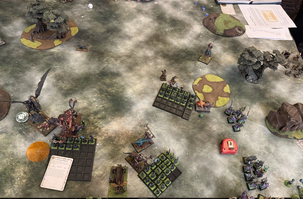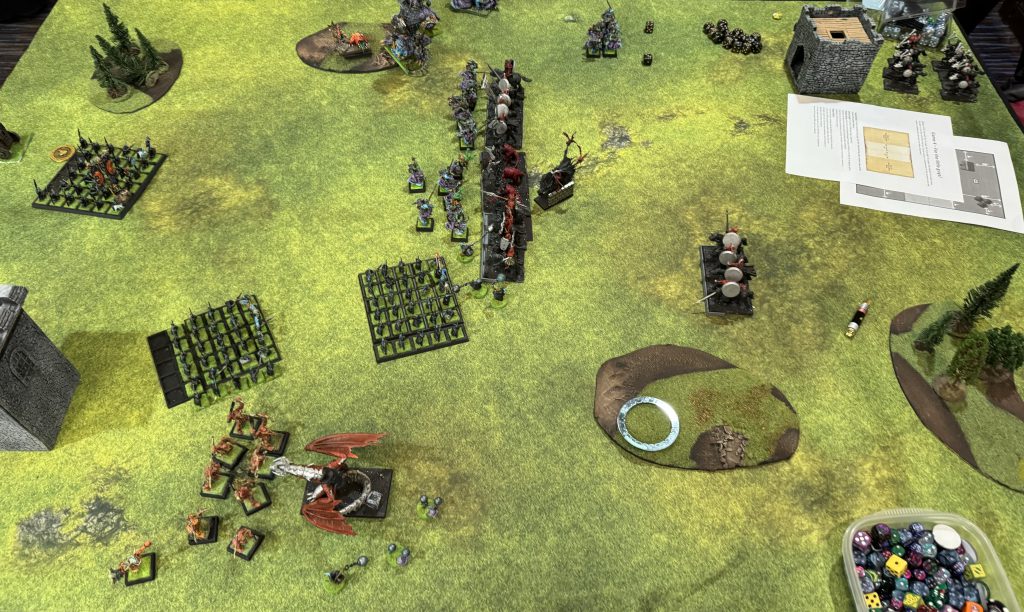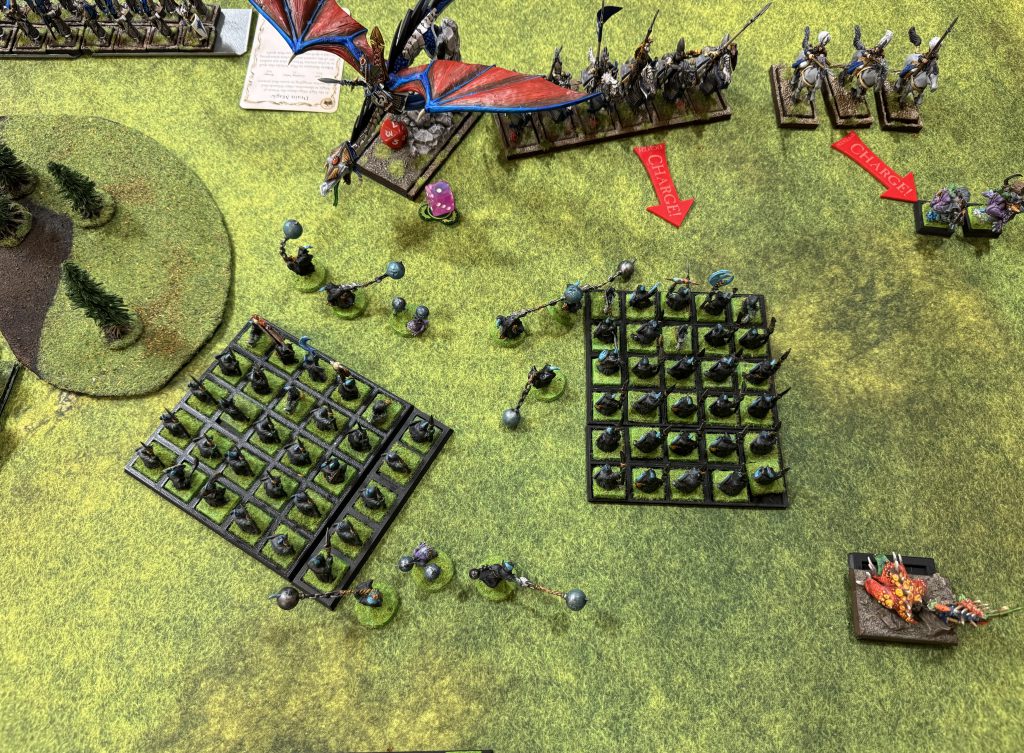 My opponent round two is a local from a community I’ve been playing with since pre-COVID. I had just beaten up his Bretonnians at a previous RT so he was out for vengeance. His list featured a large block of sword masters, a lvl4 illusion wizard, a prince on dragon with the dreaded 3+, 5++, 5+++ statline and some other cav and shooting units.I don’t out threat him reliably, but I sure do shoot better! He wins turn one and moves forward very aggressively. Creating a very fanatic friendly battle line. I respond kindly…marching two units up and casting arcane urgency to reform one unit out of marching column. The rest of my army stays out of dragon charge range and my hoppers on the right gum up his cav to force a bad charge that I can counter with the remaining hoppers. Importantly, I get itchy nuisance off on the dragon to drop it to T5 and do 2 wounds with shooting/magic.