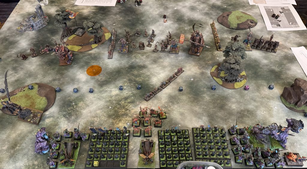 I get paired down into a Beastmen player running a MSU build. His list highlights were a Viletide + Elementalism + Hagtree fetish lvl4 shaman on chariot, a beast lord on chariot, a Shaggoth, dragon ogres, and chaos spawn (the little bro version) with the mark of Khorne.