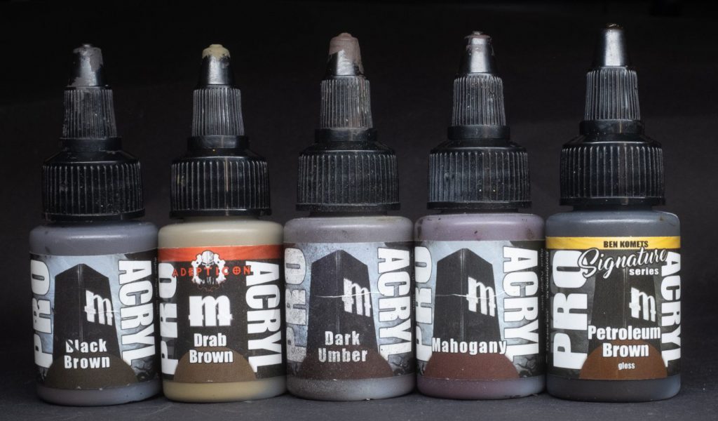 Petroleum Brown - A glossy oleaginous brown from the Ben Komets signature series, Petroleum Brown functions very handily as both a way to add greasy oil stains to your grimdark sci-fi vehicles and also as a way to shade gold metallics without reducing their shininess. A niche paint, but a useful one.