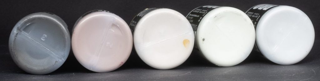 Pale Pink - An even brighter almost cherry blossom version of its sibling, this paint is almost white with the tiniest blush of pink, similar to the web colour Lavender Blush, useful for very very bright highlights on pinkish flesh.