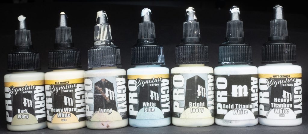 Dark Ivory - The darkest member of the Ivory triad, this paint is part of the Ninjon signature series, as you can imagine from the name, it’s a good base shadow tone for bones, tusks, claws, and all manner of warm white applications.Heavy Warm White - Part of the Ben Komets signature series, and one of two heavy body paints in the current ProAcryl roster, HWW is a thicker, goopier consistency than the rest of the ProAcryl line. Some small subtext saying “Loaded Brush” next to the paint name lets you know the apparently intended use case for this paint, though I’ve found it pretty good both for mixing and for just doing very precise white highlights on all kinds of things.