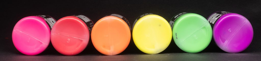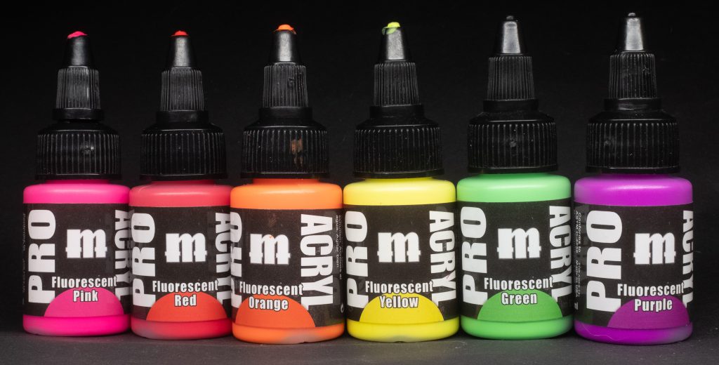 NB: All fluorescent paints cover like absolute arse, so please mentally add “covers like arse” to the end of each of these descriptions. You’ll notice that there is no Blue in this category, according to the source this is because it’s very difficult to make a good fluorescent blue paint.I'm a bit iffy on fluorescents honestly, but I tried them anyway, here are my impressions: