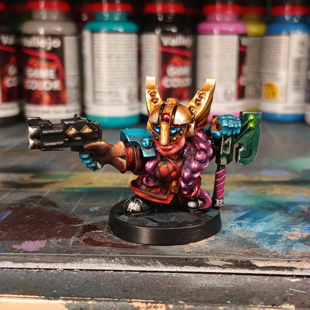 Helmet: Imperial Gold, Axe: Dusken Green, Hair-Ring: Ruby Red, Gun-barrels: Sterling SilverThe system is pretty simple: You basecoat with (unsurprisingly) the Base or Airbrush paint, wash with the Shade paint, touch up with the Base paint, and then highlight with the Light. In my experience, outside of the gold-bronze-silver spectrum, most other coloured metallic paints are pretty lacklustre; either they're not very shiny or the colours are simply not strongly saturated enough -- since they are made metallic by the addition of silvery particles, they then somewhat towards paler, greyish colours. Thank goodness, then, that the TMM paints are a total revelation in this regard; the colours are strong and perfectly saturated, with tons of punch. Ruby Red in particular is a stunningly strong blood red metallic colour that absolutely pops.