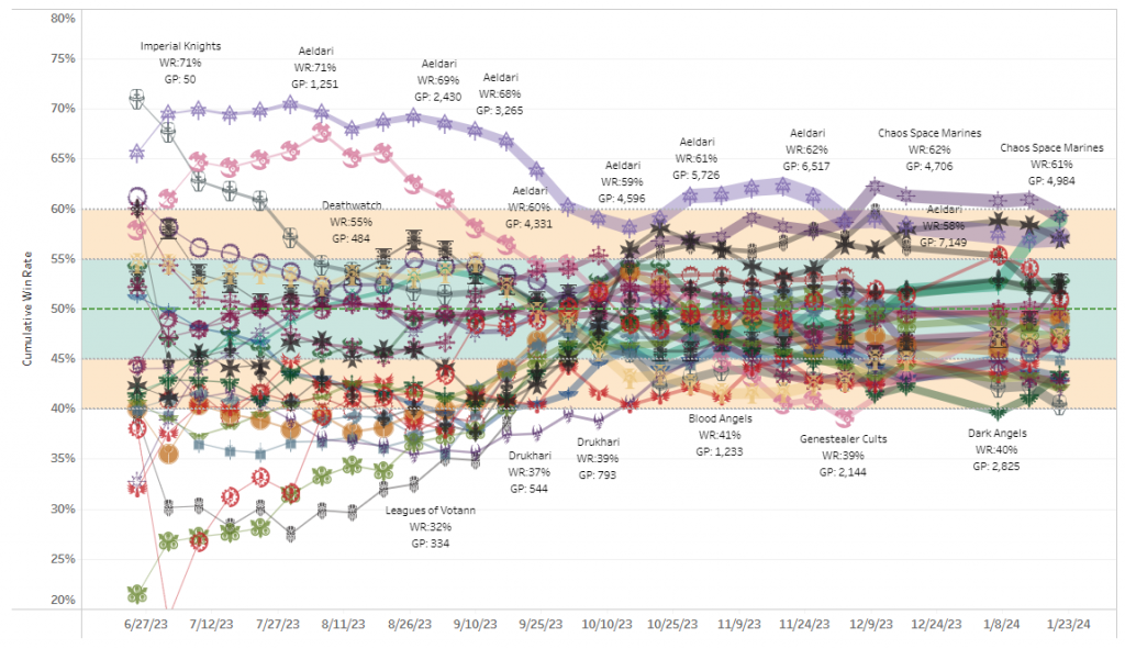 Curie: Jeremy aka Curie from Stat Check here - the above chart shows a 4-week rolling average for win rates for each faction. It has been created using very similar data to the set presented in the summary table, and turned into a lovely visualization by “Custode” Cliff. As previously mentioned, the meta since the last dataslate in September has converged into a much nicer group of fairly balanced armies than the initial launch of the edition. There remain some outliers - most notably Imperial Knights / Drukhari at the bottom of the meta, and Aeldari / Chaos Space Marines at the top of the meta - but it’s felt like a much more fun game to play since the previous balance dataslate. Nearly every army has had at least one GT win, and we’re seeing some very good diversity in the top 4’s.