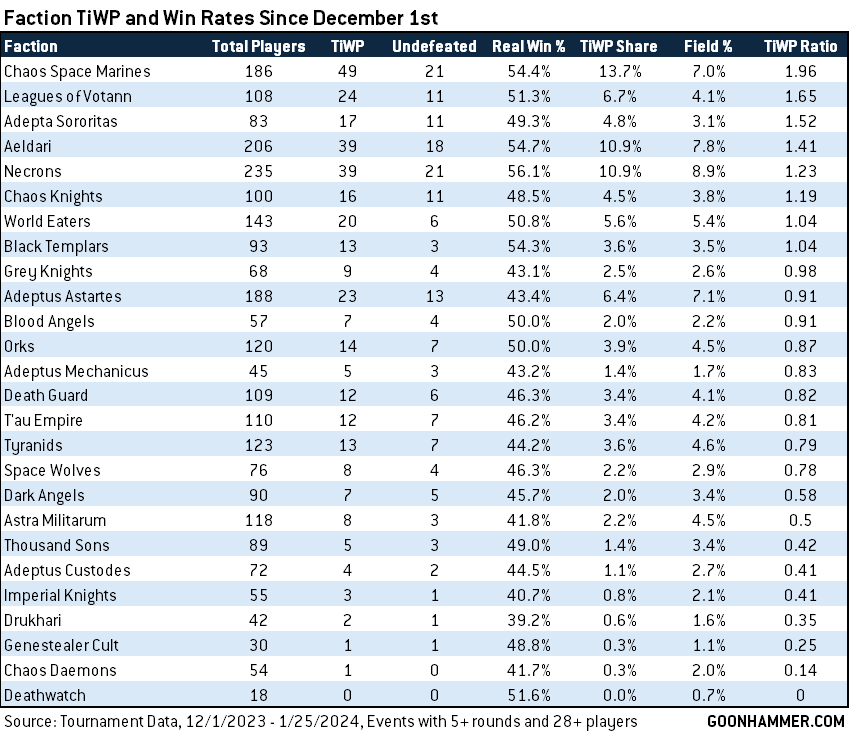 So What does TiWP tell us? Well for starters, it tells us that since December 1st, Chaos Space Marines, Leagues of Votann, Adepta Sororitas, Aeldari, and Necrons are the top dogs in the meta, each outperforming expectations. None of these is more than double their expectation (we’ve seen TiWP Ratios go well above 3 and 4 in the most degenerate of times), and most of the game’s factions are above 0.75 - pretty healthy. CSM clearly need an adjustment, especially as they’re 7% of the field, but Necrons are rapidly creeping up in the mix as well, particularly with wins at the UTC Finals, LVO, Torino Open, and the Nottingham Super Major (and considering that their new book was not in play for some of December’s biggest events)..