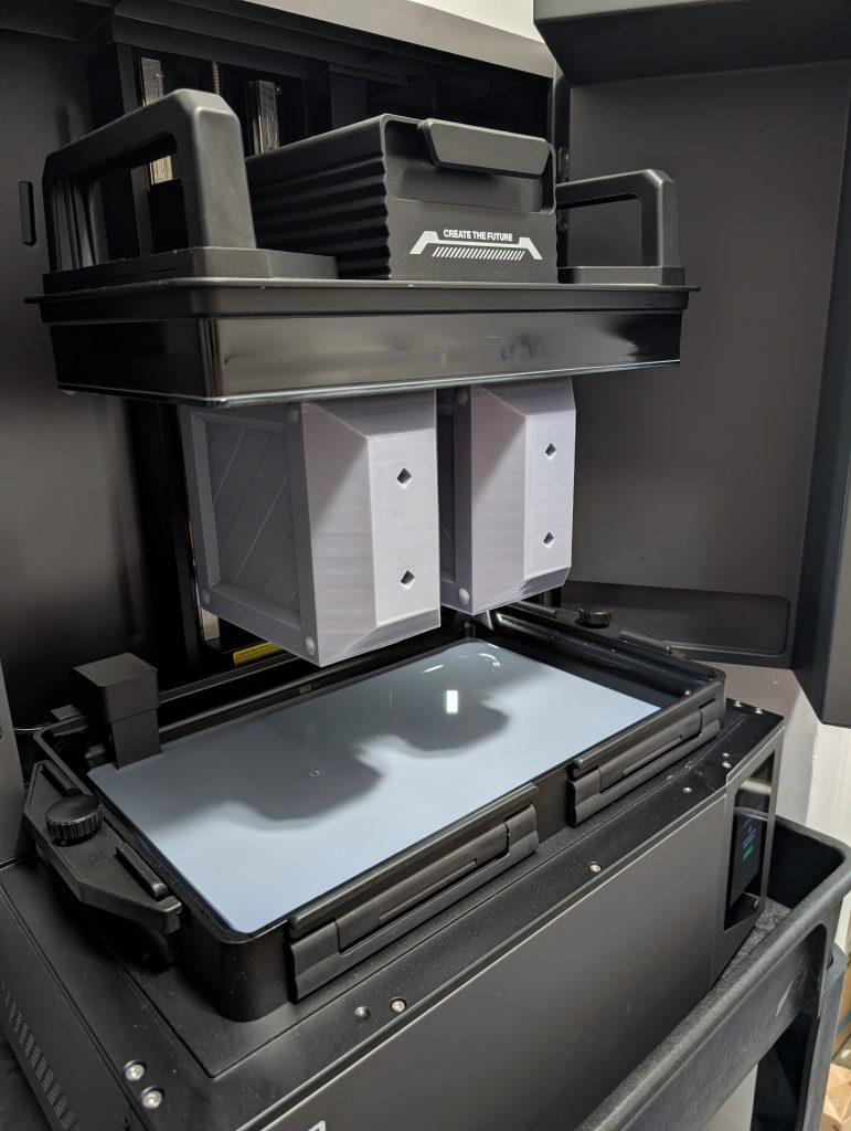 It cannot be understated how large and heavy this thing is. I highly recommend having a friend help you remove it from the box; it's contained in a bag and if you're unloading it by yourself (like I was) the bag will rip. The build quality is phenomenal as usual, with the minor exception of a cosmetic detail on the tape surrounding the screen. The doors are solid, everything is machined to a high degree of quality, and the system is easily removed and connected. The only manual effort required is the resin recycling system on the back; you need to connect some hoses and the provided Velcro straps are a bit finicky. Setup via wireless is seamless and there's no assembly required. The doors swing out on both sides are require a considerable amount of space; you can see how the door by the screen is hitting the wall. I would estimate that the total "wingspan" of the doors is as much as four feet if you want as much access as possible, but it's not necessary. I found putting the part on a wheeled Harbor Freight cart was helpful.After you plug the machine in and set up Internet connectivity, it will go through a self-check system and make sure everything is fine. You may be tempted to immediately pour in resin and get to printing; do not do that. Instead look up the manual leveling procedure and perform that first. If you don't then you run the risk of the auto-leveling not working and you having to clean the build plate of all resin before you can level anything. Manual leveling is very easy; there are four screws hidden behind the plastic covers on top of the build plate and the machine just needs you to adjust them until the tension on all four screws is even. The process took about two minutes.