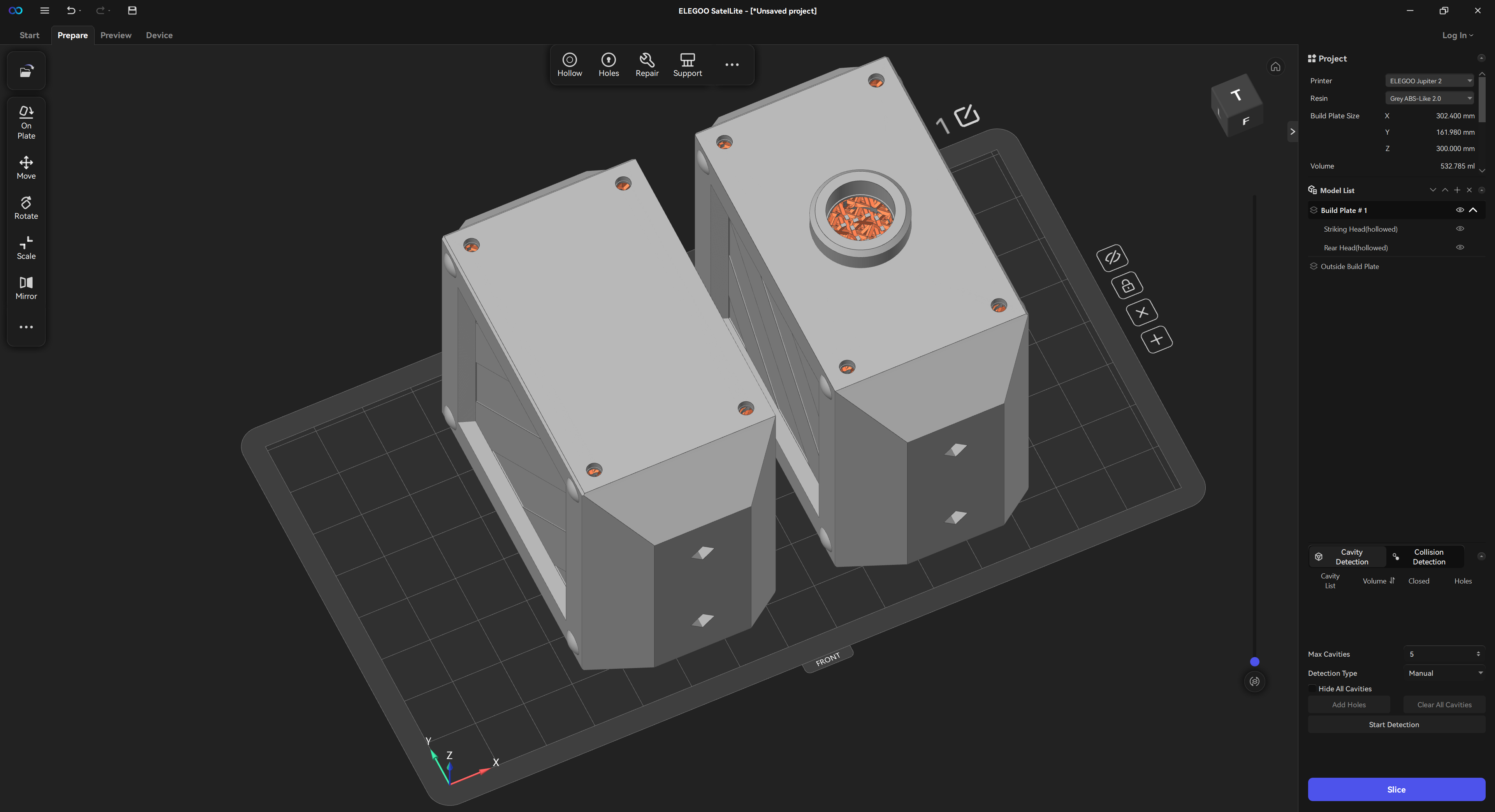 Elegoo's SatelLite slicer software already has machine and resin profiles available; you can search for the exact combination, and it will automatically load. From there you add your model, orient it, apply support strategy, and slice. For the most part it works pretty well. The software doesn't have as many options for supports or rafts as something like Lychee, but it's free and in my opinion there's very little that you can't make work. It's clear that Elegoo put a lot of work into figuring out bare necessities and then refined the software so that it was as effective as possible. In the image above you can an example of some of the more advanced capabilities. I started with those thunder hammer heads in Autodesk Fusion and then hollowed and added holes in SatelLite so that the print would be successful. If you're modeling your own part, then I recommend modeling reference points before you use the slicer. The SatelLite software relies on you manually positioning holes with your mouse on the surface of the part which makes precision difficult.