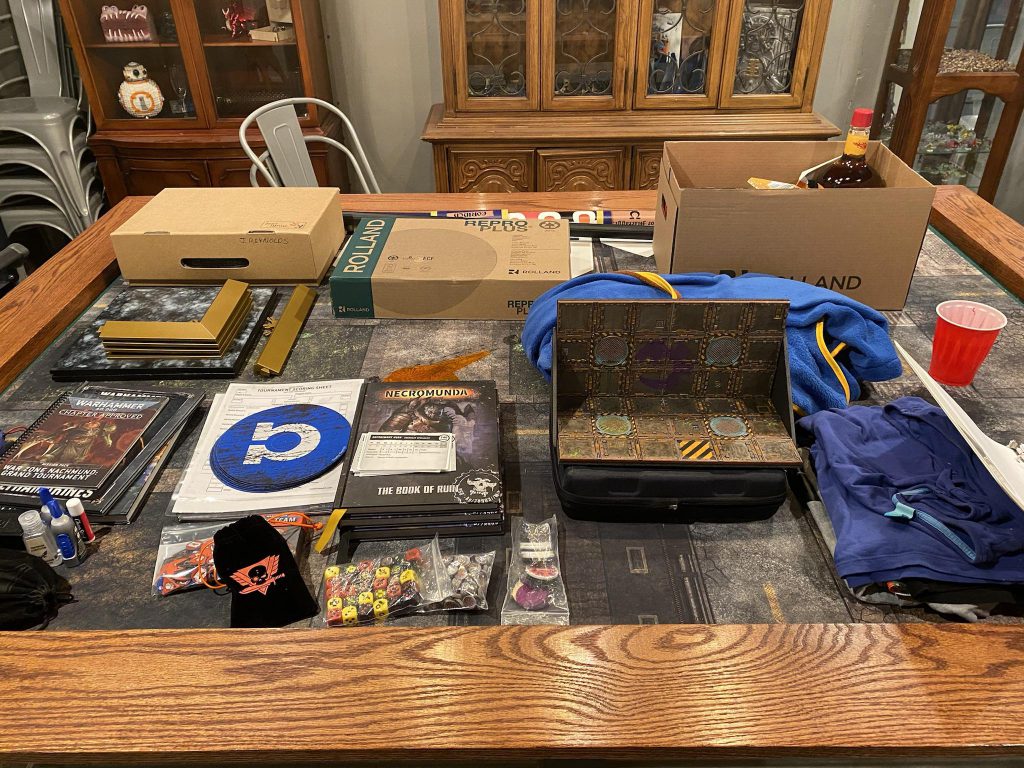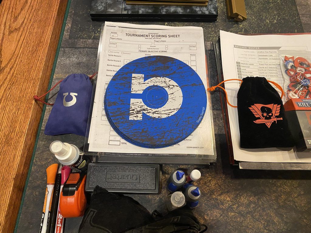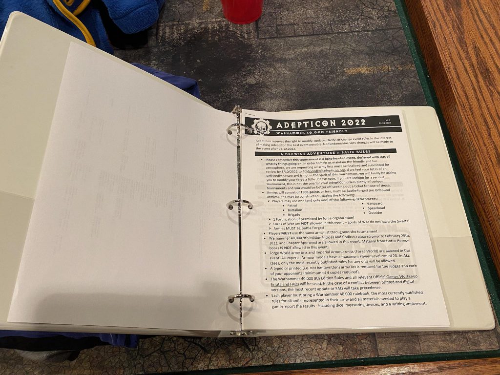 With this in mind I printed off the rules packet for each event, and then lists for my forces. I then went to the GW website and printed off the most current errata and FAQs that are relevant to me, and put it all into a handy binder. I then double checked to ensure that I had all the relevant gaming aids: rulebooks, dice, measuring devices, score sheets, etc. I even went so far as to laminate things like my Kill Team Roster and Gang Cards so I could better keep track of what I am using from game to game.