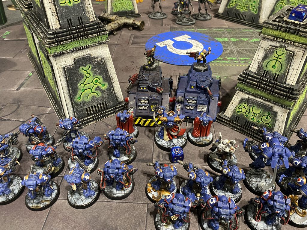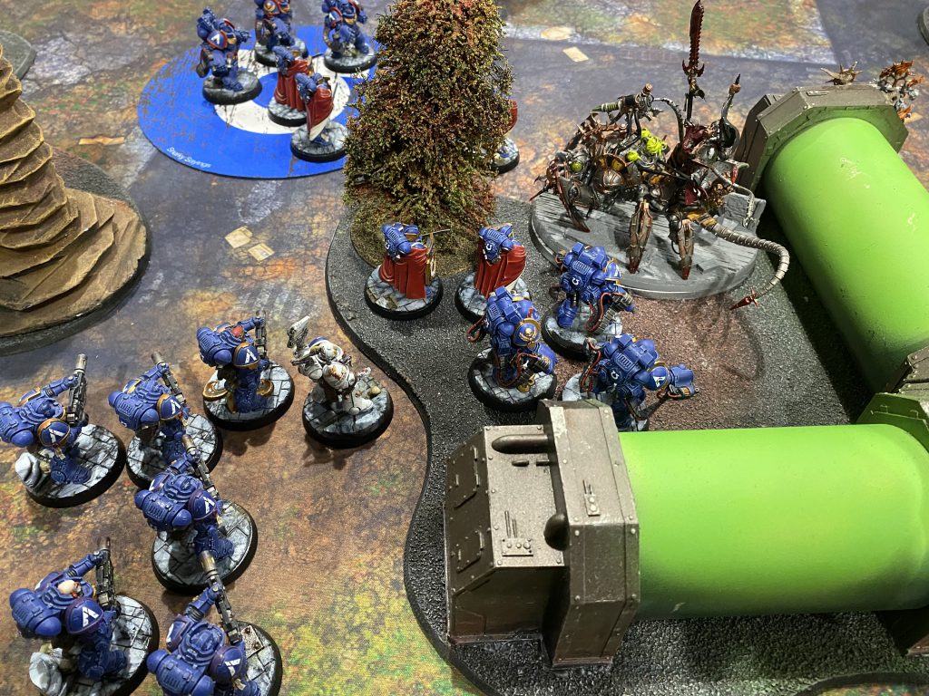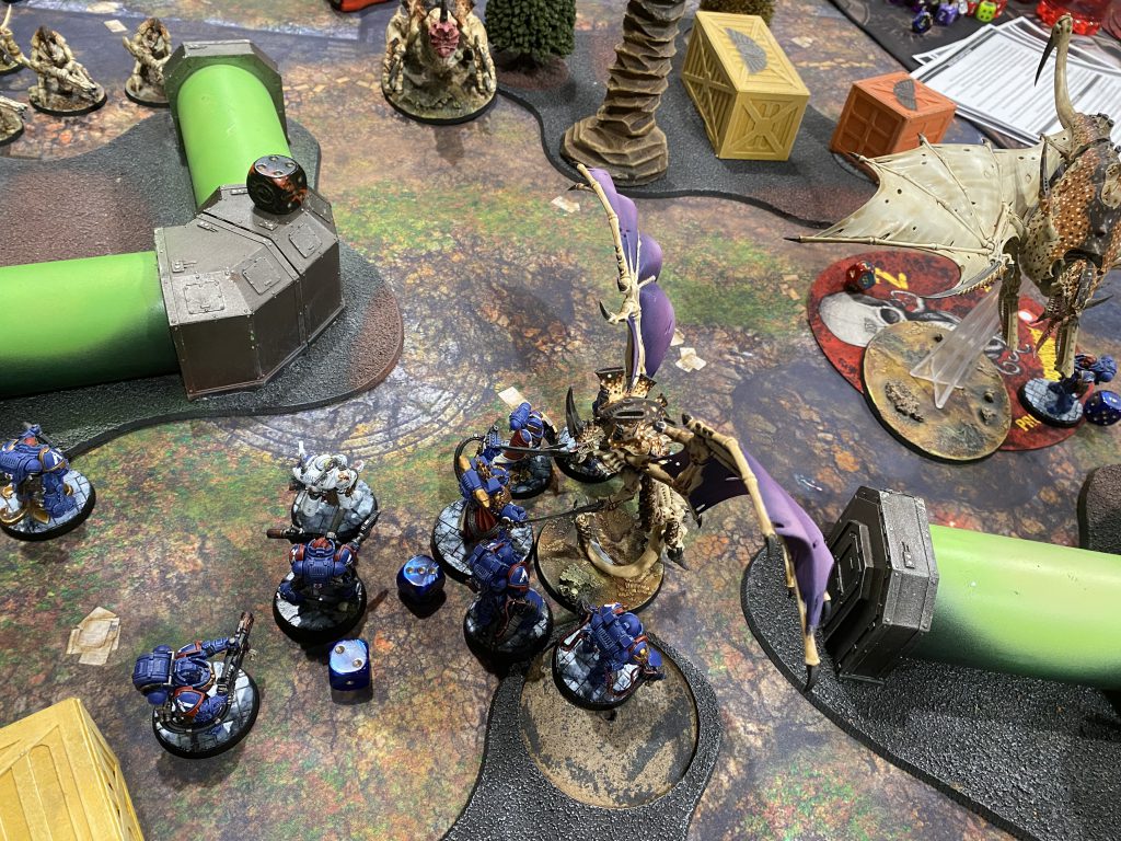 This led to a very funny knockdown fight in the middle where Marneus Calgar and his Honor Guard got locked in the Tyrant and the Swarmlord for basically the entire match, both us liberally using our new stratagems and other special items to keep our respective heroes going well beyond when they should’ve died. The specifics of the mission basically required me to have units escape the table, and him kill my units, and while the battle was largely a bloody stalemate in the center I had the points lead come the end. Not that any of that matters in the Friendly.