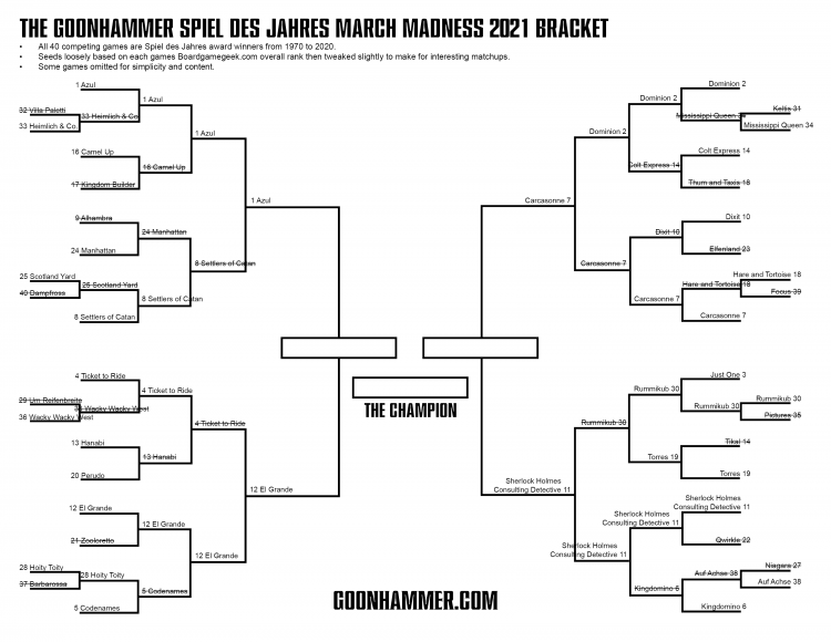 El Grande's upset fueled run ends in the Final Four, unfortunately. This was a close match. El Grande jumped to an early lead out of the gate before Azul dug it's tiled hands into the ground and clawed back to tie it at the half. The game remained close through the first 17 TV timeouts before the venerable area control classic simply ran out of gas.
