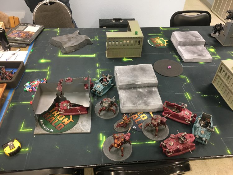 Nick doesn't seize and pops Prepared Positions. I push out aggressively, using the Ls to provide places for my priests and the hill to get LOS for my crawlers. I advanced the Dunerider with the troops to get over into his quadrant for recon and start blasting. I pick up the closest plane and do three (so zero) damage to the Redemptor and kill some troops. He shoots back doing not a ton, killing a crawler and the top ride with the priests (and half moves them with his Thunderfire) but things felt ok.
