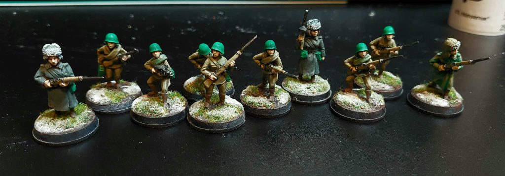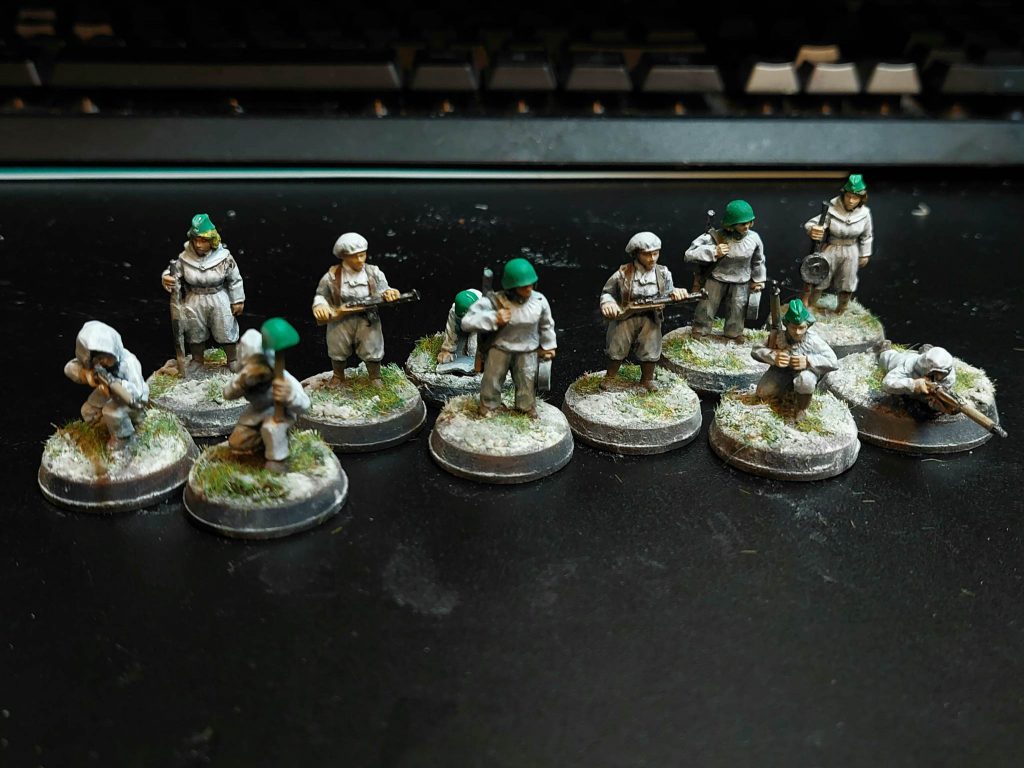 A standard format infantry squad. Credit: HardyRoachThe models themselves for this project are almost all from Bad Squiddo (bar the vehicles and bannerwoman), who I recommend heartily. I was aiming for a depiction from around the autumn of 1943 or 44, and as such I purchased a mix of summer and winter uniformed troops, with the idea that not all troops were either able or willing to switch to greatcoats just yet.