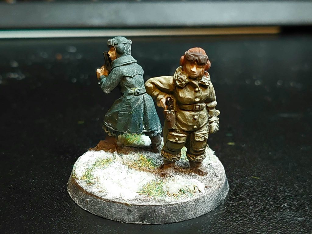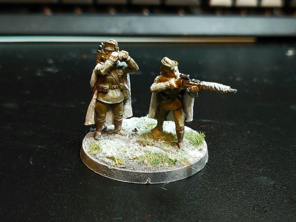 A pair of Night Witches, here used as a CoC Jump-Off Point. Credit: HardyRoachFor painting, I first zenithal primed everything with an airbrush, then gave all the uniforms an airbrush coat of Vallejo Khaki, and the helmets a deep green. The fun thing about Soviet uniforms is that you can get away with basically any shade on the spectrum of green to brown. Uniforms were made somewhat hurriedly, and there wasn’t any real system of standardisation. Besides after field use uniforms tend to change colour from wear, so yeah, any shade you like, as long as it’s earthy. Greatcoats in particular varied enormously in colour, so they’ve been painted a mix of khaki, green and dark grey-green. The scout squad, I figure, were better equipped for the winter due to their more precarious position, so they’re equipped with the white smocks and trousers issued to snipers and scout units for winter camouflage. The snipers have khaki uniforms, but with winter capes for the purposes of camouflage.