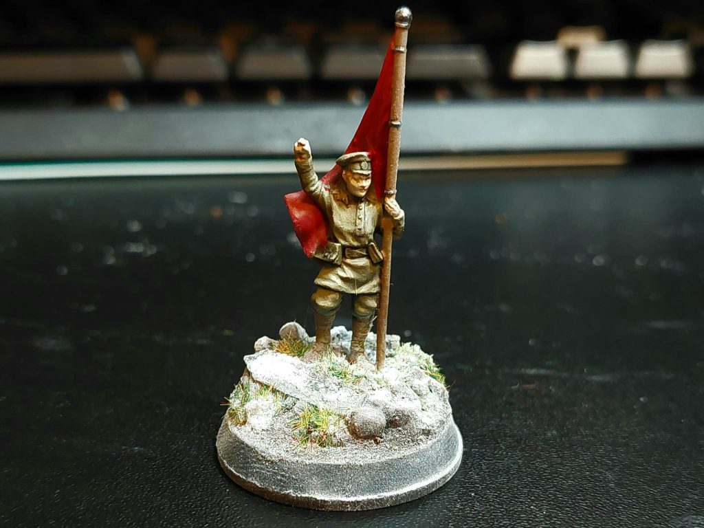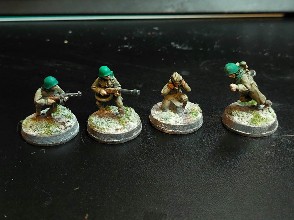 A flamethrower team, an artillery observer, and a sapper. Credit: HardyRoachMy platoon scale game of choice for this period is Chain of Command, so I constructed the force itself with that in mind. A late-war Soviet Infantry Platoon in that system has a baseline of three squads, each consisting of 7 riflemen, two LMG crew, and an NCO; as well as a commander.